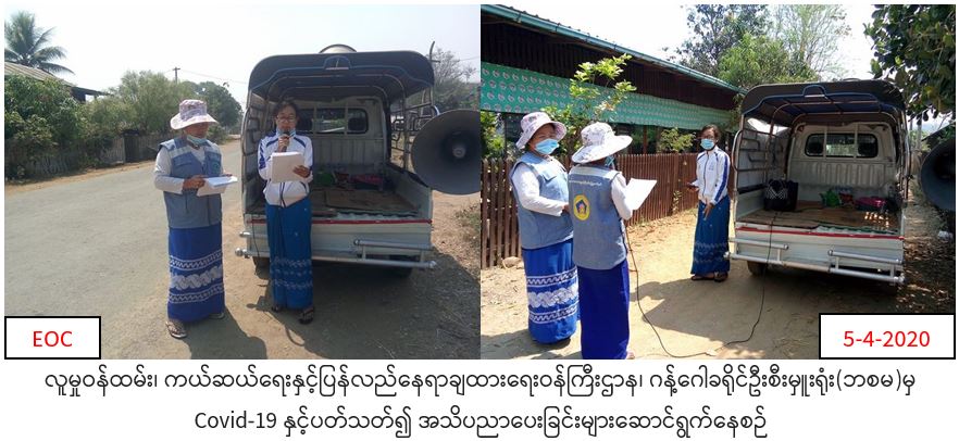 လူမှုဝန်ထမ်း၊ ကယ်ဆယ်ရေးနှင့်ပြန်လည်နေရာချထားရေးဝန်ကြီးဌာန၊ ဘေးအန္တရာယ်ဆိုင်ရာစီမံခန့်ခွဲမှုဦးစီးဌာန၊ ဂန့်ဂေါခရိုင်ဦးစီးမှူးရုံးမှ တာဝန်ရှိသူများသည် လူမှုဝန်ထမ်းဦးစီးဌာန၊ မာဃသဟာယ လူမှုအထောက်အကူပြုအဖွဲ့တို့ဖြင့်ပူးပေါင်းပြီး ဂန့်ဂေါခရိုင်၊ ထီးလင်းမြို့နယ်၊ တောမကျေးရွာ၊ ညောင်ဇဉ်ကျေးရွာများသို့(၅-၄-၂၀၂၀)ရက်နေ့ (၀၈:၃၀)နာရီမှ (၁၅:၃၀)နာရီအချိန်ထိ COVID-19 ရောဂါနှင့် ပတ်သက်၍ ကာကွယ်၊ တားဆီး၊ ထိန်းချုပ်၊ ကုသရေးဆိုင်ရာ ပြည်သူလူထု အသိပညာပေးပန်ကြားချက်များကို လှည့်လည် ဟောပြောဆောင်ရွက်ခဲ့ကြောင်း သတင်းရရှိပါသည်။