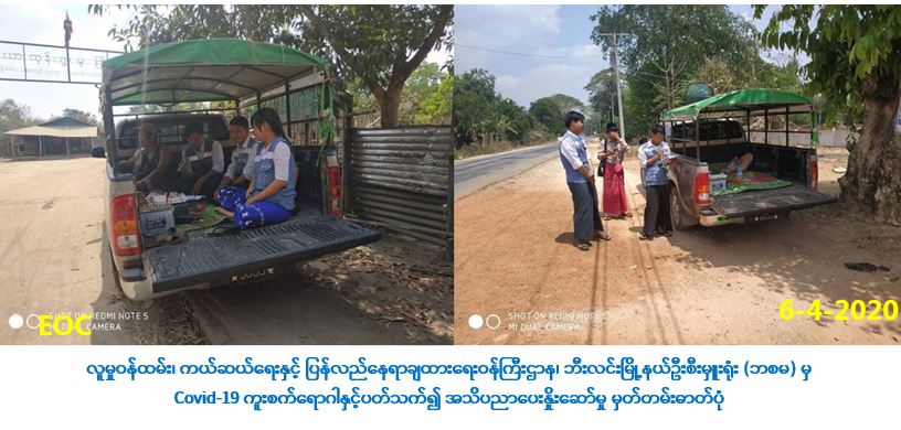လူမှုဝန်ထမ်း၊ ကယ်ဆယ်ရေးနှင့် ပြန်လည်နေရာချထားရေးဝန်ကြီးဌာန၊ ဘေးအန္တရာယ်ဆိုင်ရာစီမံ ခန့်ခွဲမှုဦးစီးဌာန၊ မွန်ပြည်နယ်၊ သထုံခရိုင်၊ ဘီးလင်းမြို့နယ်ဦးစီးမှူးရုံးမှ တာဝန်ရှိသူများသည် (၆-၄-၂၀၂၀) ရက်နေ့၊ (၀၈:၀၀) နာရီမှ စတင်ပြီး ဘီးလင်းမြို့နယ်၊ ရင်းအုံကျေးရွာအုပ်စုနှင့် မဲလံကျေးရွာ တို့တွင် COVID-19 ကူးစက်ရောဂါနှင့် ပတ်သက်ပြီး ဆောင်ရန်/ရှောင်ရန် အချက်များအား အသိပညာပေးနှိုးဆော်ခြင်းများ ဆောင်ရွက်လျက်ရှိကြောင်း သတင်းရရှိပါသည်။