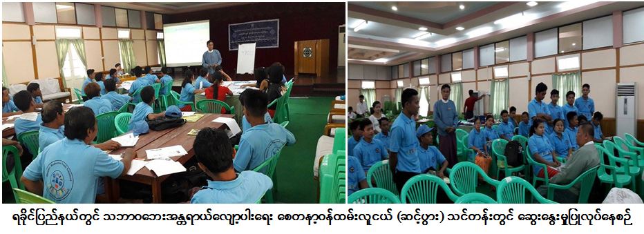 ကယ်ဆယ်ရေးနှင့် ပြန်လည်နေရာချထားရေးဦးစီးဌာန၊ ရခိုင်ပြည်နယ်ဦးစီးမှူးရုံးမှ တာဝန်ရှိသူများသည် ရခိုင်ပြည်နယ်၊ စစ်တွေမြို့၊ မင်းသူရိယခန်းမတွင် ရက် (၁၀၀) စီမံချက်အရဆောင်ရွက်သည့် သဘာဝဘေးအန္တရာယ်လျော့ပါးရေး စေတနာ့ဝန်ထမ်းလူငယ် (ဆင့်ပွား)သင်တန်းဖွင့်ပွဲကို (၂၀-၆-၂၀၁၆) ရက်နေ့တွင် ဖွင့်လှစ်ခဲ့ရာ လူဦးရေ (၃၀) ဦး တက်ရောက်ခဲ့ ကြောင်း သိရှိရပါသည်။