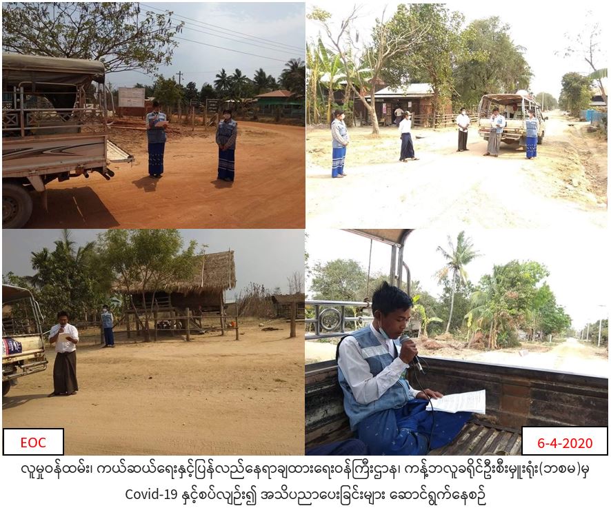 လူမှုဝန်ထမ်း၊ ကယ်ဆယ်ရေးနှင့်ပြန်လည်နေရာချထားရေးဝန်ကြီးဌာန၊ ဘေးအန္တရာယ်ဆိုင်ရာစီမံခန့်ခွဲမှုဦးစီးဌာန၊ ကန့်ဘလူခရိုင်ဦးစီးမှူးရုံးမှ (၅-၄-၂၀၂၀)ရက်နေ့တွင် ကျွန်းလှမြို့နယ် အင်တိုင်းကျေးရွာအုပ်စု (အင်တိုင်းကျေးရွာ၊ကျွဲတဲကျေးရွာ)၊ ကျောက်အိုင်ကျေးရွာအုပ်စု (ကျောက်အိုင်ကျေးရွာ၊ ငှက်ပျောတောကျေးရွာ)၊ ညောင်ကိုင်းကျေးရွာအုပ်စု (ညောင်ကိုင်းကျေးရွာ၊ ကနီ ကျေးရွာ၊ ပေါယောကျေးရွာ၊ မြင်သာကျေးရွာ၊ စစ်တောကျေးရွာ၊ သရက်တစ်ထောင်ကျေးရွာ)များရှိ မိဘပြည်သူများအား COVID-19 ကူးစက်ရောဂါပျံ့နံ့မှုမဖြစ်ပွားစေရေးအတွက် သတိပြုလိုက်နာဆောင်ရွက်ရန် အသိပေးနှိုးဆော်ခြင်းများဆောင်ရွက်ခဲ့ကြောင်း သတင်းရရှိပါသည်။