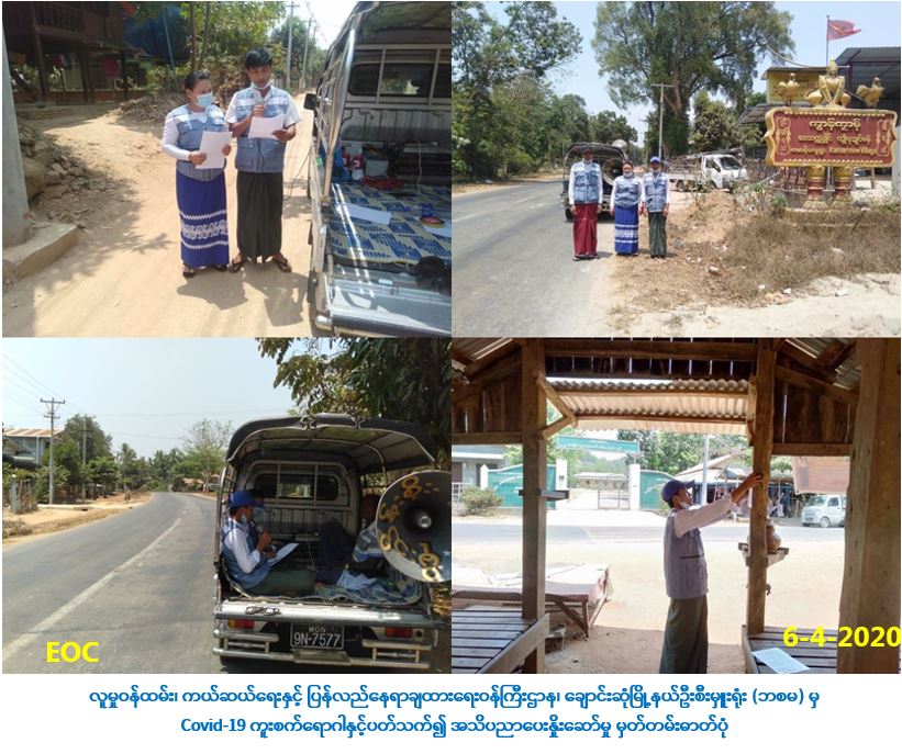 လူမှုဝန်ထမ်း၊ ကယ်ဆယ်ရေးနှင့် ပြန်လည်နေရာချထားရေးဝန်ကြီးဌာန၊ ဘေးအန္တရာယ်ဆိုင်ရာစီမံ ခန့်ခွဲမှုဦးစီးဌာန၊ ချောင်းဆုံမြို့နယ်ဦးစီးမှူးရုံးမှ တာဝန်ရှိသူများသည် (၆-၄-၂၀၂၀) ရက်နေ့၊ (၀၉:၃၀) နာရီအချိန်မှ (၁၁:၃၀) နာရီအချိန်ထိ မွန်ပြည်နယ်၊ မော်လမြိုင်ခရိုင်၊ ချောင်းဆုံမြို့နယ်၊ ကဒါကျေးရွာနှင့် ကမာမိုကျေးရွာအတွင်းရှိ လမ်းဆုံလမ်းခွများနှင့် လူစည်ကားရာနေရာများတွင် COVID-19 ကူးစက် ရောဂါနှင့်ပတ်သက်၍ ကြိုတင်ကာကွယ်ထိန်းချုပ်နိုင်ရန် ပြည်သူသို့ အသိပညာပေးပန်ကြားချက်များ အား အသံချဲ့စက်များဖြင့် လှည့်လည်အသိပေးဟောပြောခြင်းများ ဆောင်ရွက်ခဲ့ပါကြောင်း သတင်းရရှိ ပါသည်။