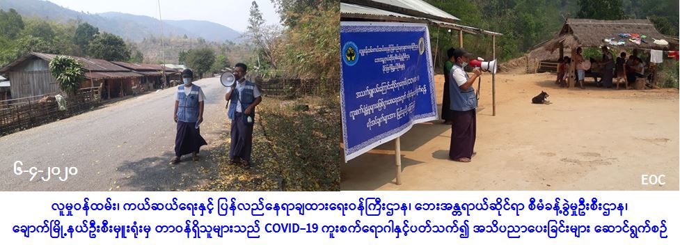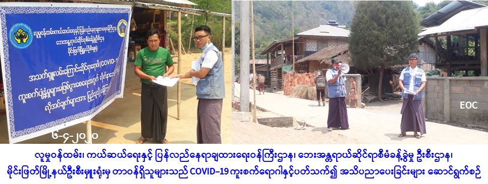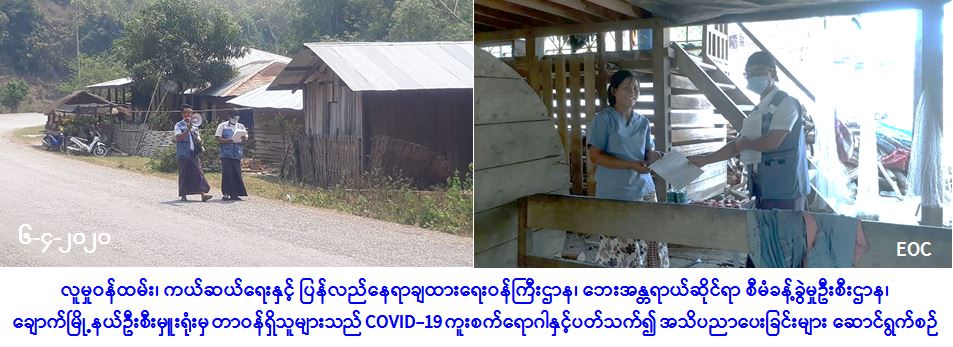 လူမှုဝန်ထမ်း၊ ကယ်ဆယ်ရေးနှင့် ပြန်လည်နေရာချထားရေးဝန်ကြီးဌာန၊ ဘေးအန္တရာယ်ဆိုင်ရာစီမံ ခန့်ခွဲမှုဦးစီးဌာန၊ မိုင်းဖြတ်မြို့နယ်ဦးစီးမှူးရုံးမှ တာဝန်ရှိသူများသည် (၆-၄-၂၀၂၀) ရက်နေ့၊ နံနက် (၀၉:၀၀) နာရီမှစ၍ မိုင်းဖြတ်မြို့နယ်၊ ဆိုင်းလေကျေးရွာ၊ ဆွတ်ပလောင်းကျေးရွာနှင့် တာကျောက်ကျေးရွာများအတွင်း COVID-19 ရောဂါ ကူးစက်ပျံ့နှံ့မှုများ မဖြစ်ပွားစေရန်အတွက် ဆောင်ရန်/ ရှောင်ရန်များအား မြန်မာဘာသာ၊ လားဟူဘာသာစကားတို့ဖြင့် အသိပညာပေး နှိုးဆော်ခြင်းများ ပြုလုပ်ဆောင်ရွက်ခဲ့ကြောင်း သတင်းရှိရပါသည်။