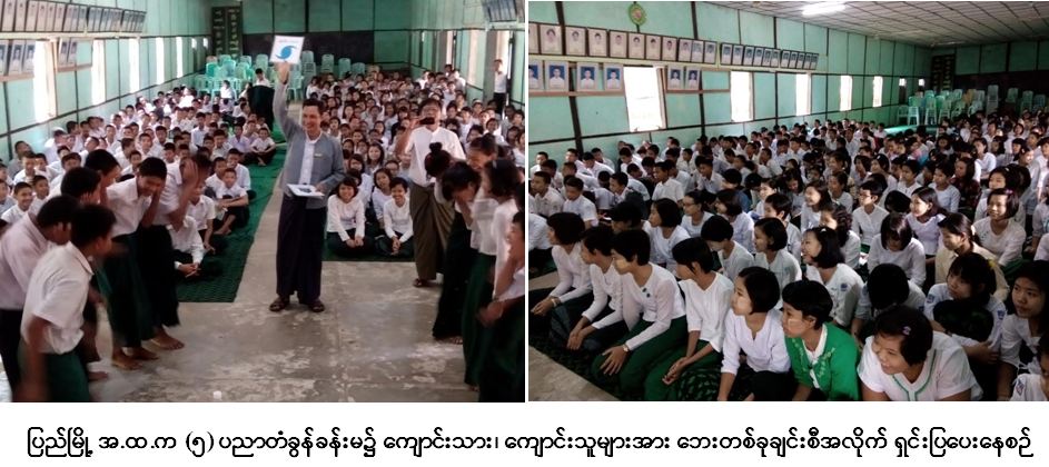 ကယ်ဆယ်ရေးနှင့် ပြန်လည်နေရာချထားရေးဦးစီးဌာန၊ ပြည်ခရိုင်ဦးစီးမှူးရုံးမှ တာဝန်ရှိသူများသည် ပဲခူးတိုင်း ဒေသကြီး၊ ပြည်မြို့ အ.ထ.က (၅) ပညာတံခွန်ခန်းမ၌ သဘာဝဘေးအန္တရာယ်ဆိုင်ရာ အသိပညာပေးဟောပြော ပွဲကို (၂၀-၆-၂၀၁၆) ရက်နေ့တွင် ကျင်းပခဲ့ရာ ကျောင်းသား၊ ကျောင်းသူ ဦးရေ (၃၀၀) ကျော် တက်ရောက် ခဲ့ကြောင်း သတင်းရရှိပါသည်။