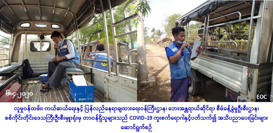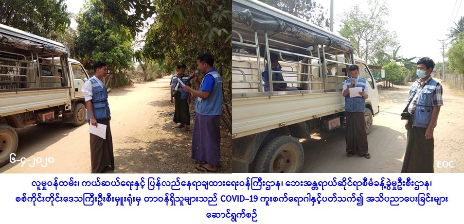 လူမှုဝန်ထမ်း၊ ကယ်ဆယ်ရေးနှင့် ပြန်လည်နေရာချထားရေးဝန်ကြီးဌာန၊ ဘေးအန္တရာယ်ဆိုင်ရာစီမံ ခန့်ခွဲမှုဦးစီးဌာန၊ စစ်ကိုင်းတိုင်းဒေသကြီးဦးစီးမှူးရုံးမှ တာဝန်ရှိသူများသည် (၆-၄-၂၀၂၀) ရက်နေ့တွင် ယင်းမာပင်မြို့နယ်နှင့် ကနီမြို့နယ်များအတွင်းရှိ နတ်လာပို့တောင်ကျေးရွာ၊ နွားခြံကုန်ကျေးရွာ၊ ယင်းပိုးကျေးရွာ၊ ကျောက်ကုန်းကျေးရွာ၊ နှောပင်ကျေးရွာ၊ ကျွန်းပေါ်ကျေးရွာ၊ ကျောက်မှော်ကျေးရွာနှင့် နဘူးတောကျေးရွာများ၌ COVID-19 ရောဂါ ကူးစက်ပျံ့နှံ့မှုများ မဖြစ်ပွားစေရန်အတွက် အများပြည်သူများ အလွယ်တကူသိရှိလိုက်နာဆောင်ရွက်နိုင်မည့် ဆောင်ရန်/ ရှောင်ရန်များကို ကျေးရွာအုပ်ချုပ်ရေးမှူးများ၊ ရပ်မိရပ်ဖများနှင့်အတူ အသိပညာပေး နှိုးဆော်ခြင်းများ ပြုလုပ်ဆောင်ရွက်ခဲ့ကြောင်း သတင်းရှိရပါသည်။