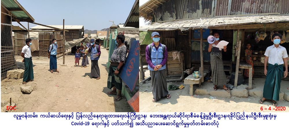 လူမှုဝန်ထမ်း၊ ကယ်ဆယ်ရေးနှင့်ပြန်လည်နေရာချထားရေးဝန်ကြီးဌာန၊ ဘေးအန္တရာယ်ဆိုင်ရာစီမံခန့်ခွဲမှုဦးစီးဌာန၊ ရခိုင်ပြည်နယ် ဦးစီးမှူးရုံးမှ တာဝန်ရှိသူများသည် (၆-၄-၂၀၂၀) ရက်၊ (၁၀:၀၀)နာရီတွင် ပေါက်တောမြို့ ၊ အနောက်ရွဲ IDP စခန်း၌ စခန်း နေပြည်သူများအတွက် Covid-19 ကူးစက်ရောဂါနှင့်ပတ်သက်ပြီး ဆောင်ရန်၊ ရှောင်ရန်များအား စခန်းကော်မတီဝင်များနှင့်ပူးပေါင်း၍ အသိပေးဆော်သြခဲ့ပါကြောင်း သတင်းရရှိပါသည်။