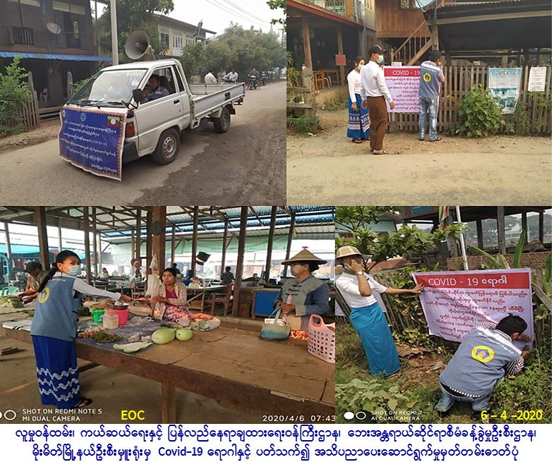 လူမှုဝန်ထမ်း၊ ကယ်ဆယ်ရေးနှင့်ပြန်လည်နေရာချထားရေးဝန်ကြီးဌာန၊ ဘေးအန္တရာယ်ဆိုင်ရာစီမံခန့်ခွဲမှုဦးစီးဌာန၊ မိုးမိတ် မြို့နယ်ဦးစီးမှူးရုံးမှ တာဝန်ရှိသူများသည် မဘိမ်းမြို့နယ်၊ လူမှုဝန်ထမ်းဦးစီးဌာနနှင့် ပူးပေါင်း၍ မဘိမ်းမြို့နယ်၊ မြို့မရပ်ကွက်၊ တိုက်ကုန်းရပ်ကွက်၊ ကုန်းခါးရပ်ကွက်၊နမ့်ပုံးပုံးရပ်ကွက် ကုန်းမခမ်ေကျးရွာနှင့် လဝါကျေးရွာတို့တွင် (၆-၄-၂၀၂၀) ရက်နေ့၊ (၇:၃၀) နာရီမှ (၁၄:၀၀) နာရီအထိ အသက်ရှူလမ်းကြောင်းဆိုင်ရာရောဂါ (COVID-19) ကူးစက်ပျံ့နှံ့မှုများမဖြစ်စေရေးအတွက် လိုက်နာဆောင်ရွက်ရန်လိုအပ်ချက်များအား ပြည်သူသို့ ပန်ကြားခြင်းအစီအစဉ်ကို ဆောင်ရွက်ခြင်းနှင့် အသိပညာပေး လက်ကမ်းစာစောင်များဖြန့်ဝေခြင်း၊ ဗွီနိုင်းပိုစတာ ဆိုင်းဘုတ်များ ကပ်ခြင်းလုပ်ငန်းများဆောင်ရွက်ခဲ့ပါကြောင်း သတင်းရရှိပါသည်။
