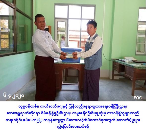 လူမှုဝန်ထမ်း၊ ကယ်ဆယ်ရေးနှင့် ပြန်လည်နေရာချထားရေးဝန်ကြီးဌာန၊ ဘေးအန္တရာယ်ဆိုင်ရာစီမံ ခန့်ခွဲမှုဦးစီးဌာန၊ တမူးခရိုင်ဦးစီးမှူးရုံးမှ တာဝန်ရှိသူများသည် (၄-၄-၂၀၂၀) ရက်နေ့တွင် တမူးခရိုင်၊ ခမ်းပါတ်မြို့၊ ကနန်ကျေးရွာ၌ ဖြစ်ပွားခဲ့သော မီးဘေးကြောင့် မီးလောင်ဆုံးရှုံးခဲ့သည့် နေအိမ် (၁) လုံးမှ အိမ်ထောင်စု (၁) စုအတွက် ကယ်ဆယ်ရေးပစ္စည်း (၁၇) မျိုး (၁) အိမ်ထောင်စာ၊ အိမ်ဆောက်ပစ္စည်းဖိုးထောက်ပံ့ငွေ (၁၀၀၀၀၀) ကျပ်နှင့် ဆန်ရိက္ခာဖိုးထောက်ပံ့ငွေ (၂၁၀၀၀) ကျပ်တိတိတို့အား (၆-၄-၂၀၂၀) ရက်နေ့၊ (၁၄:၀၀) နာရီအချိန်တွင် မြို့နယ်အထွေထွေအုပ်ချုပ်ရေးဦးစီးဌာနမှ တဆင့် လွှဲပြောင်းထောက်ပံ့ပေးခဲ့ကြောင်း သတင်းရရှိပါသည်။