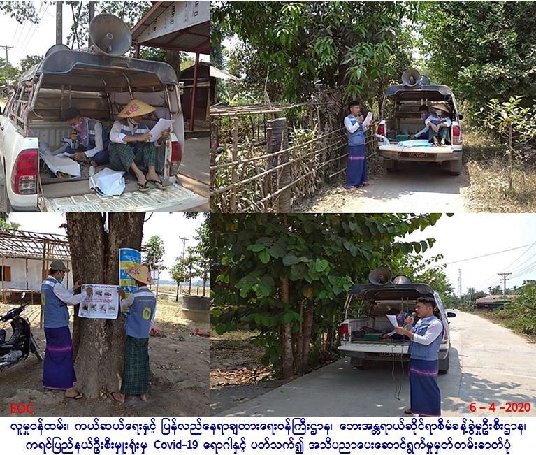 လူမှုဝန်ထမ်း၊ ကယ်ဆယ်ရေးနှင့်ပြန်လည်နေရာချထားရေးဝန်ကြီးဌာန၊ ဘေးအန္တရာယ်ဆိုင်ရာစီမံခန့်ခွဲမှုဦးစီးဌာန၊ ကရင် ပြည်နယ်ဦးစီးမှူးရုံးမှ တာဝန်ရှိသူများသည် (၆.၄.၂၀၂၀) ရက်နေ့တွင် ဘာအံမြို့နယ်အတွင်းရှိ မုက္ကဒိကျေးရွာ ခဲတောက်ကျေးရွာ ကျုံပိုက်ကျေးရွာ ကူးဆိပ်ကျေးရွာ ရွာကြီးကျေးရွာနှင့်ရွာလေးကျေးရွာများသို့ COVID -19နှင့်ပတ်သက်သည့် အသိပညာပေးခြင်း များကို ကျေးရွာအုပ်ချုပ်ရးမှူးများနှင့်ပူးပေါင်းဆောင်ရွက်ခဲ့ပါကြောင်း သတင်းရရှိပါသည်။
