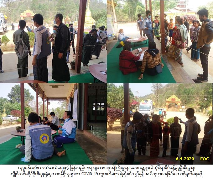 လူမှုဝန်ထမ်း၊ ကယ်ဆယ်ရေးနှင့် ပြန်လည်နေရာချထားရေးဝန်ကြီးဌာန၊ ဘေးအန္တရာယ်ဆိုင်ရာစီမံခန့်ခွဲမှုဦးစီး ဌာန၊ လွိုင်လင်ခရိုင်ဦးစီးမှူးရုံးမှတာဝန်ရှိသူများသည် (၆-၄-၂၀၂၀) ရက်နေ့တွင် ပန်ခေါက်ဝိုး Covid-19 စစ်ဆေးရေးဂိတ်၌ ခရီးသွားပြည်သူများအား ခရီးသွားရာဇဝင်စစ်ဆေးခြင်း၊ ကိုယ်အပူချိန်တိုင်းတာခြင်း၊ Covid-19 ကူးစက်ရောဂါနှင့်စပ်လျဉ်း၍ ဆောင်ရန်/ရှောင်ရန်အချက်များကို အသိပညာပေးခြင်းများ ဆောင်ရွက်ခဲ့ပါ ကြောင်း သတင်းရရှိပါသည်။