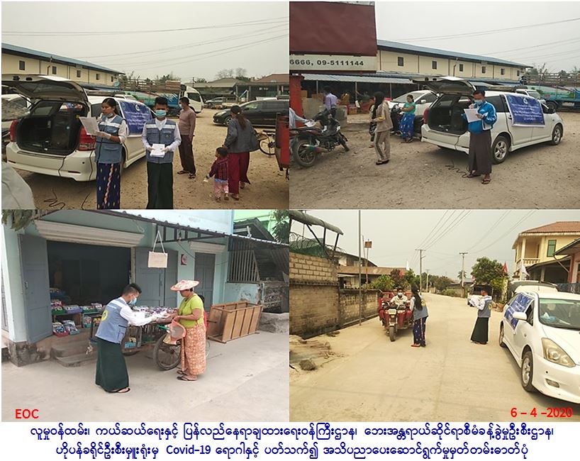 လူမှုဝန်ထမ်း၊ ကယ်ဆယ်ရေးနှင့်ပြန်လည်နေရာချထားရေးဝန်ကြီးဌာန၊ ဘေးအန္တရာယ်ဆိုင်ရာစီမံခန့်ခွဲမှုဦးစီးဌာန၊ ဟိုပန်ခရိုင် ဦးစီးမှူးရုံးမှ တာဝန်ရှိသူများသည် ပြန်ကြားရေးနှင့်ပြည်သူ့ဆက်ဆံရေးဦးစီးဌာနတို့နှင့် ပူးပေါင်း၍ (၆-၄-၂၀၂၀) ရက်နေ့တွင် ဟိုပန်မြို့နယ်အတွင်းရှိ ဟိုပန်မြို့မဈေးရပ်ကွက်၊ မန်ခွန်ရပ်ကွက်နှင့် မန်ကောင်းရပ်ကွက်တို့၌ Covid-19ရောဂါကူးစက် ပျံ့နှံ့မှုမဖြစ်ပွားစေရန် သိရှိလိုက်နာ ဆောင်ရွက်ရမည့်အချက်များကို အသိပေးဟောပြောခြင်း၊ လက်ကမ်းစာစောင်များ ဖြန့်ဝေ ပေးခြင်းများ ဆောင်ရွက်ခဲ့ပါကြောင်း သတင်းရရှိပါသည်။
