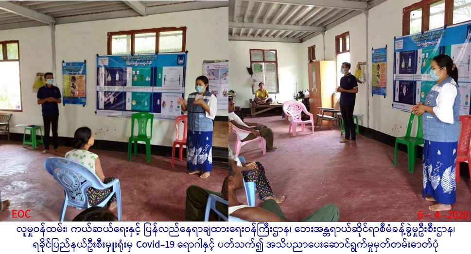 လူမှုဝန်ထမ်း၊ ကယ်ဆယ်ရေးနှင့်ပြန်လည်နေရာချထားရေးဝန်ကြီးဌာန၊ ဘေးအန္တရာယ်ဆိုင်ရာစီမံခန့်ခွဲမှုဦးစီးဌာန၊ ရခိုင် ပြည်နယ်ဦးစီးမှူးရုံးမှ တာဝန်ရှိသူများသည် (၆-၄-၂၀၂၀) ရက်၊ (၁၂:၀၀) နာရီတွင် စစ်တွေမြို့ ၊ ကံပြင်ရွာဟောင်း၌ ကျေးရွာနေပြည်သူများအတွက် Covid-19 ကူးစက်ရောဂါနှင့်ပတ်သက်ပြီး အသိပညာပေးခြင်းကို PSSAG အဖွဲ့အစည်းနှင့် ပူးပေါင်း၍ ဆောင်ရွက်ခဲ့ပါကြောင်း သတင်းရရှိပါသည်။