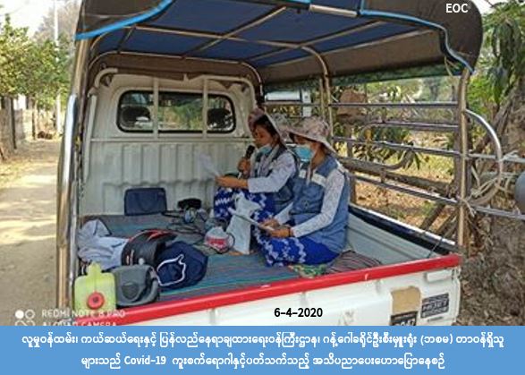 လူမှုဝန်ထမ်း၊ ကယ်ဆယ်ရေးနှင့် ပြန်လည်နေရာချ ထားရေးဝန်ကြီးဌာန၊ ဘေးအန္တရာယ်ဆိုင်ရာစီမံခန့်ခွဲ မှုဦးစီးဌာန၊ ဂန့်ဂေါခရိုင်ဦးစီးမှူးရုံးမှ တာဝန်ရှိသူများသည် ပြန်ကြားရေးနင့် ပြည်သူ့ဆက်ဆံရေးဦးစီး ဌာန၊ မာဃသဟာယ လူမှုအထောက်အကူပြု အဖွဲ့တို့ဖြင့်ပူးပေါင်းပြီး ဂန့်ဂေါခရိုင်၊ ဂန့်ဂေါမြို့နယ်၊ အုတ်လှကျေးရွာ၊ လုံဟောကျေးရွာ၊ ဇာဟောကျေး ရွာ၊ တောင်ယာပြင်ကျေးရွာ၊ လုံခြုံကျေးရွာ၊ မကျည်းခင်ကျေးရွာ၊ ဇီးပြားကျေးရွာများသို့ (၆-၄-၂၀၂၀)ရက်နေ့ (၀၈:၀၀)နာရီမှ (၁၆:၀၀)နာရီအချိန်ထိ COVID-19 ရောဂါနှင့် ပတ်သက်၍ ကာကွယ်၊ တားဆီး၊ ထိန်းချုပ်၊ ကုသရေးဆိုင်ရာ ပြည်သူလူထု အသိပညာပေး ပန်ကြားချက်များကို လှည့်လည် ဟောပြော ဆောင်ရွက်ခဲ့ပါကြောင်း သိရှိရပါသည်။