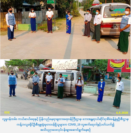 လူမှုဝန်ထမ်း၊ ကယ်ဆယ်ရေးနှင့် ပြန်လည်နေရာချထားရေးဝန်ကြီးဌာန၊ ဘေးအန္တရာယ်ဆိုင်ရာစီမံခန့်ခွဲမှုဉီးစီးဌာန၊ ကန့်ဘလူခရိုင်ဦးစီးမှူးရုံးမှ တာဝန်ရှိသူများသည် (၆-၄-၂၀၂၀) ရက်နေ့တွင် ကန့်ဘလူမြို့ အမှတ် (၁) (၂)၊ (၃)၊ (၄)၊ (၅) ရပ်ကွက်များနှင့်၊ ကန့်ဘလူမြို့နယ် စန္ဒယားရွာမကျေးရွာအုပ်စု (စန္ဒယားရွာသစ်ကျေးရွာနှင့် ရွာသစ်ကုန်းကျေးရွာ) များသို့ COVID-19 ရောဂါကူးစက်ပြန့်ပွားမှုများ မဖြစ်ပွားစေရေးအတွက် ခရိုင်ပြန်ကြားရေးနှင့် ပြည်သူ့ဆက်ဆံရေးဦးစီးဌာန၊ ပရမသုခ လူမှုကူညီရေးအသင်း (ကန့်ဘလူမြို့) တို့နှင့်ပူးပေါင်း၍ မိဘပြည်သူများအား သိရှိလိုက်နာဆောင်ရွက်ရမည့်အချက်များကို အသိပညာပေးနှိုးဆော် ဆောင်ရွက်ခဲ့ပါကြောင်း သတင်းရှိပါသည်။