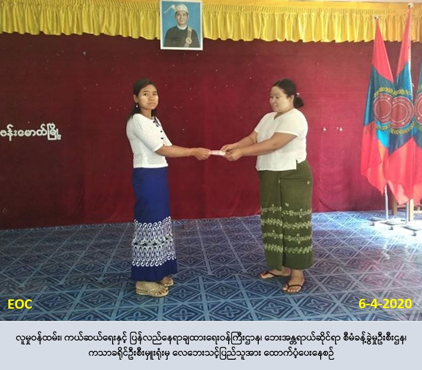 လူမှုဝန်ထမ်း၊ ကယ်ဆယ်ရေးနှင့် ပြန်လည်နေရာချထားရေးဝန်ကြီးဌာန၊ ဘေးအန္တရာယ်ဆိုင်ရာ စီမံခန့်ခွဲမှုဦးစီးဌာန၊ ကသာခရိုင်ဦးစီးမှူးရုံးမှ တာဝန်ရှိသူများသည် ကသာခရိုင်၊ ဗန်းမောက်မြို့ နယ် ၊နောင်ကန်အုပ်စု၊ နောင်ကွတ်ကျေးရွာတွင် (၆-၄-၂၀၂၀) ရက်နေ့တွင် လေပြင်းတိုက် ခတ်မှုကြောင့် အမိုးလန်နေအိမ် (၁) လုံးအတွက် အိမ်ဆောက်ပစ္စည်းဖိုး (၇၅၀၀၀/-) ကျပ်ကို (၇-၄-၂၀) ရက်နေ့ ၊ (၀၉ : ၀၀)နာရီအချိန်တွင် သက်ဆိုင်ရာအထွေထွေအုပ်ချုပ်ရေးဦးစီးဌာနမှ တဆင့် ဘေးသင့်ပြည်သူထံသို့ ထောက်ပံ့ပေးခဲ့ကြောင်းသတင်းရရှိပါသည်။