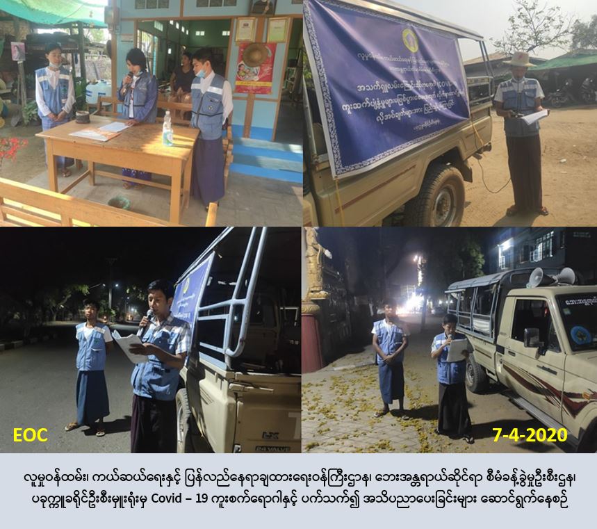 လူမှုဝန်ထမ်း၊ ကယ်ဆယ်ရေးနှင့် ပြန်လည်နေရာချထားရေးဝန်ကြီးဌာန၊ ဘေးအန္တရာယ်ဆိုင်ရာ စီမံခန့်ခွဲမှုဦးစီးဌာန၊ ပခုက္ကူခရိုင်ဦးစီးမှူးရုံးမှ တာဝန်ရှိသူများသည် (၇-၄-၂၀၂၀) ရက်နေ့၊ (၀၇:၀၀) နာရီအချိန်မှ (၁၃:၃၀)နာရီအချိန်ထိ ပခုက္ကူမြို့နယ်၊ ကမ္မမြို့ အမှတ် (၁၊ ၂၊ ၃၊ ၄၊ ၅၊ ၆) ရပ်ကွက်များသို့ သွားရောက်အသိပညာပေးခြင်းနှင့် နေ့စဉ် (၁၉:၀၀) နာရီအချိန်မှ (၂၁:၀၀) နာရီအချိန်အထိ ပခုက္ကူမြို့ပေါ်ရပ်ကွက်များသို့ COVID -19 ကူးစက်မြန်ရောဂါ ကြိုတင်ကာကွယ် ရေး ပြည်သူများသို့ အသိပညာပေး ပန်ကြားချက်များအား လှည့်လည်အသိပေးခြင်းတို့ကို ဆောင်ရွက်ခဲ့ပါကြောင်း သတင်းရရှိပါသည်။