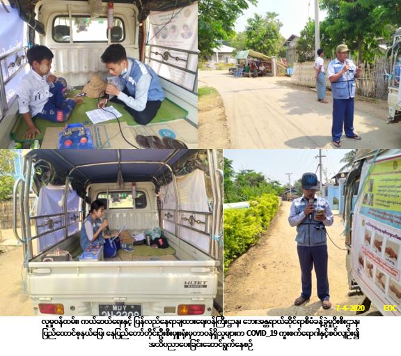 လူမှုဝန်ထမ်း၊ ကယ်ဆယ်ရေးနှင့် ပြန်လည်နေရာချထားရေးဝန်ကြီးဌာန၊ ဘေးအန္တရာယ်ဆိုင်ရာစီမံခန့်ခွဲမှုဉီးစီးဌာန၊ ပြည်ထောင်စုနယ်မြေ၊ နေပြည်တော်တိုင်းဦးစီးမှူးရုံးမှတာဝန်ရှိသူများသည် (၇-၄-၂၀၂၀) ရက်နေ့၊ (၀၉:၃၀) နာရီအချိန်မှ (၁၂:၀၀) နာရီအချိန်အထိ ပျဉ်းမနားမြို့နယ်၊ လမ်းပျဉ်းမနားဟောင်းအုပ်စု၊ စည်ကောက်ကျေးရွာ၊ ကြို့ပင်အရှေ့ကျေးရွာ၊ ကြို့ပင်အလယ်ကျေးရွာ၊ ကြို့ပင်အနောက်ကျေးရွာနှင့် ပြူတွင်းကျေးရွာအုပ်စု၊ သရက်ကုန်းကျေးရွာ၊ သရက်ပင်ကျေးရွာများ၌ COVID-19 ကူးစက်ရောဂါနှင့်စပ်လျဉ်း၍ ဆောင်ရန်/ရှောင်ရန်အချက်များကို အသိပညာပေးနှိုးဆော်ခဲ့ပါကြောင်း သတင်းရရှိိပါသည်။