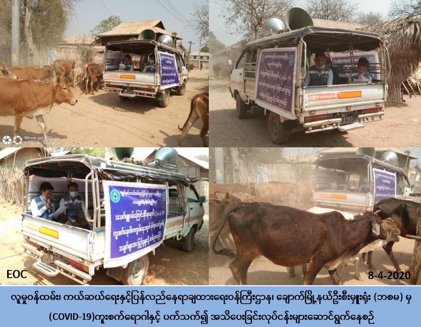 လူမှုဝန်ထမ်း၊ ကယ်ဆယ်ရေးနှင့် ပြန်လည်နေရာချထားရေးဝန်ကြီးဌာန၊ ဘေးအန္တရာယ်ဆိုင်ရာ စီမံခန့်ခွဲမှုဦးစီးဌာန၊ ချောက်မြို့နယ်ဦးစီးမှူးရုံးမှ တာဝန်ရှိသူများသည် (၈-၄-၂၀၂၀) ရက်နေ့တွင် ချောက်မြို့နယ်အတွင်းရှိ ကံတောက်ကျောင်းကျေးရွာနှင့် တွင်းလပ်ကျေးရွာသို့ covid 19 ရောဂါ ကာကွယ်ထိန်းချုပ်ရေးနှင့် အသိပညာပေးခြင်းကို ဆောင်ရွက်ခဲ့ပါကြောင်း သတင်းရရှိပါသည်။