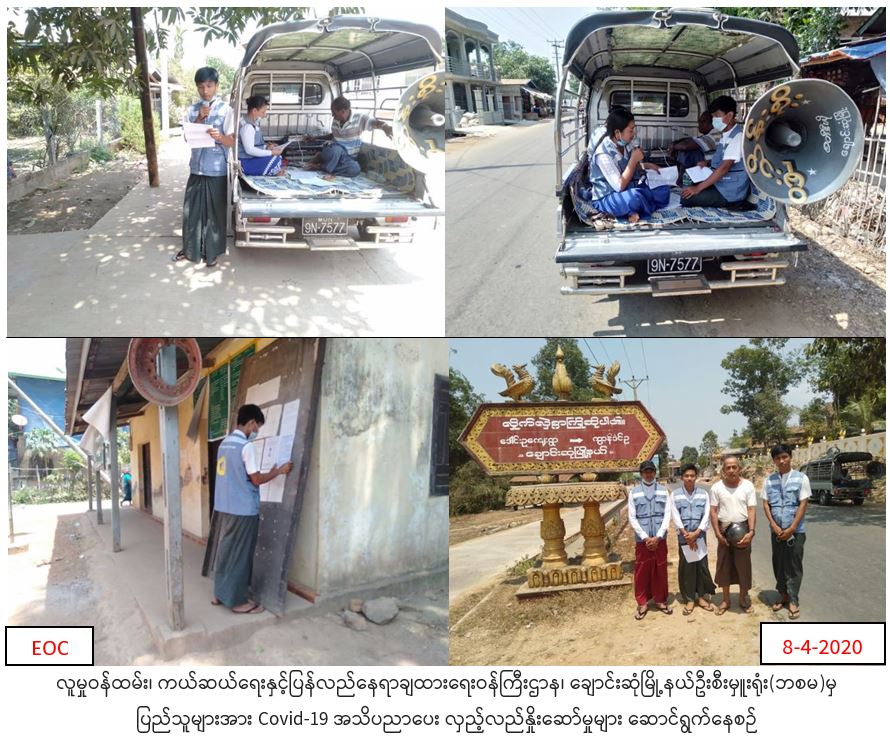 လူမှုဝန်ထမ်း၊ ကယ်ဆယ်ရေးနှင့် ပြန်လည်နေရာချထားရေးဝန်ကြီးဌာန၊ ဘေးအန္တရာယ်ဆိုင်ရာစီမံခန့်ခွဲမှုဦးစီးဌာန၊ ချောင်းဆုံမြို့နယ်ဦးစီးမှူးရုံးမှ တာဝန်ရှိသူများသည် (၈-၄-၂၀၂၀) ရက်နေ့ (၀၈:၃၀) နာရီအချိန်မှ (၁၀:၃၀) နာရီအချိန်ထိ မွန်ပြည်နယ်၊ မော်လမြိုင်ခရိုင်၊ ချောင်းဆုံမြို့နယ်၊ ဒေါင်းဥကျေးရွာနှင့် တောင်စွန်းကျေးရွာ အတွင်းရှိ လမ်းဆုံလမ်းခွများနှင့် လူစည်ကားရာနေရာများတွင် COVID -19 ကူးစက်ရောဂါနှင့်ပတ်သက်၍ ကြိုတင်ကာကွယ် ထိန်းချုပ်နိုင်ရန် ပြည်သူသို့ အသိပညာပေး ပန်ကြားချက်များအား အသံချဲ့စက်များဖြင့် လှည့်လည်အသိပေး ဟောပြောခြင်းများ ဆောင်ရွက်ခဲ့ကြောင်း သတင်းရရှိပါသည်။