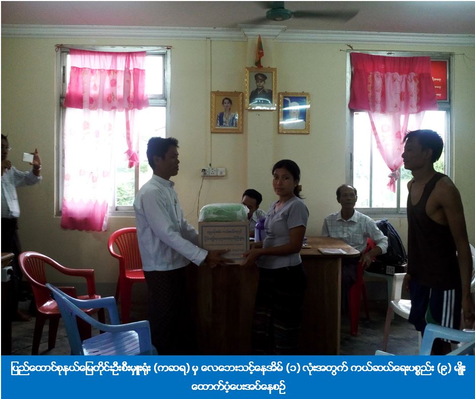 (၁၆-၆-၂၀၁၆) ရက်နေ့တွင် ပြည်ထောင်စုနယ်မြေ၊ ဇမ္ဗူသီရိမြို့နယ်၊ ရွှေကြာပင်ရပ်ကွက်၌ လေပြင်းတိုက်ခတ်မှုဖြစ်ပွားခဲ့ရာ သောက (၁) လမ်း၊ အိမ်အမှတ် (၁၈၀၈) မှာ ပိတောက်ပင်ပြိုလဲ၍ နေအိမ်ပေါ်သို့ ပိခဲ့သည့်အတွက် ပြည်ထောင်စုနယ်မြေတိုင်းဦးစီးမှူးရုံး (ကဆရ) မှ လေဘေးသင့်နေအိမ် (၁) လုံးအတွက် ကယ်ဆယ်ရေးပစ္စည်း (၉) မျိုးကို (၁၆-၆-၂၀၁၆) ရက်နေ့၊ (၁၇: ၃၀) နာရီအချိန်တွင် ကွင်းဆင်းထောက်ပံ့ခဲ့ကြောင်း သိရှိရပါသည်။