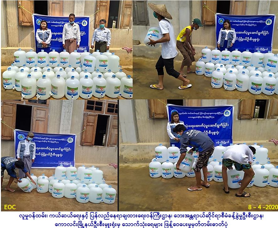 လူမှုဝန်ထမ်း၊ ကယ်ဆယ်ရေးနှင့် ပြန်လည်နေရာချထားရေးဝန်ကြီးဌာန၊ ဘေးအန္တရာယ်ဆိုင်ရာစီမံခန့်ခွဲမှုဦးစီးဌာန၊ ကောလင်း မြို့နယ်ဦးစီးမှူးရုံးမှ တာဝန်ရှိသူများသည် (၈-၄-၂၀၂၀)နေ့ (၁၃:၀၀)နာရီအချိန်တွင် ဝန်းသိုမြို့နယ်၊ နမ်းခန်းကျေးရွာအုပ်စု၊ ဘုံချောင်းရွာသို့ သောက်ရေသန့် အိမ်ထောင်စု (၁) စုလျှင် (၂၀)လီတာဆန့်ဘူးကြီး (၄)ဘူး စီဖြင့် အိမ်ထောင်စု(၇၀)စု၊ လူဦးရေ (၃၂၀)ဦးအတွက် ရေသန့်ဘူးကြီး စုစုပေါင်း (၂၈၀) အား ထောက်ပံ့ခဲ့ပါကြောင်း သတင်းရရှိပါသည်။