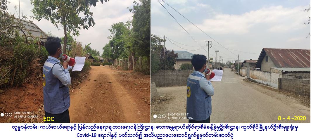 လူမှုဝန်ထမ်း၊ ကယ်ဆယ်ရေးနှင့် ပြန်လည်နေရာချထားရေးဝန်ကြီးဌာန၊ ဘေးအန္တရာယ်ဆိုင်ရာစီမံခန့်ခွဲမှုဦးစီးဌာန၊ ကွတ်ခိုင် မြို့နယ်ဦးစီးမှူးရုံးမှ တာဝန်ရှိသူများသည် (၈-၄-၂၀၂၀) ရက်နေ့တွင် ကွတ်ခိုင်မြို့နယ်၊ နားဝိုင်ကျေးရွာအုပ်စု၊ နားဝိုင်ကျေးရွာနှင့် မော်ဟစ်ကျေးရွာများသို့ အသက်ရှုလမ်းကြောင်းဆိုင်ရာ ကူးစက်ရောဂါ COVID-19 နှင့်ပတ်သက်၍ ကြိုတင်ကာကွယ်နိုင်ရေး ပြည်သူသို့ပန်ကြားချက်အသိပညာပေးမှုအား လက်ကိုင်စကားပြောစက်ဖြင့် လှည့်လည်ဟောပြောခြင်းများ ဆောင်ရွက်ခဲ့ပါ ကြောင်း သတင်းရရှိပါသည်။