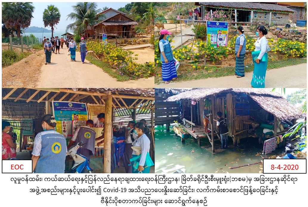 လူမှုဝန်ထမ်း၊ ကယ်ဆယ်ရေးနှင့်ပြန်လည်နေရာချထားရေးဝန်ကြီးဌာန၊ ဘေးအန္တရာယ်ဆိုင်ရာစီမံခန့်ခွဲမှုဦးစီးဌာန၊ မြိတ်ခရိုင်ဦးစီးမှူးရုံးမှ (၈.၄.၂၀၂၀)နေ့ ကျွန်းစုမြို့နယ်၊ ကမ်းကြီးကျေးရွာနှင့် ပြင်ထပ်အော်ကျေးရွာတို့တွင် COVID19 ရောဂါကူးစက်ပြန့်ပွားမှုမရှိစေရေး အသိပညာပေးဆော်သြခြင်း၊ ဗီနိုင်းပိုစတာကပ်ခြင်း၊ လက်ကမ်းစာစောင် ဝေငှခြင်းအား ခရိုင်လူမှုဝန်ထမ်း ၊ ကရုဏာလူမှုကူညီရေးအသင်း၊ ရပ်ကျေးအဖွဲ့၊ မြို့နယ်အမျိုးသမီးရေးရာကော်မတီတို့နှင့်ပူးပေါင်း၍ဆောင်ရွက်ခဲ့ကြောင်း သတင်းရရှိပါသည်။