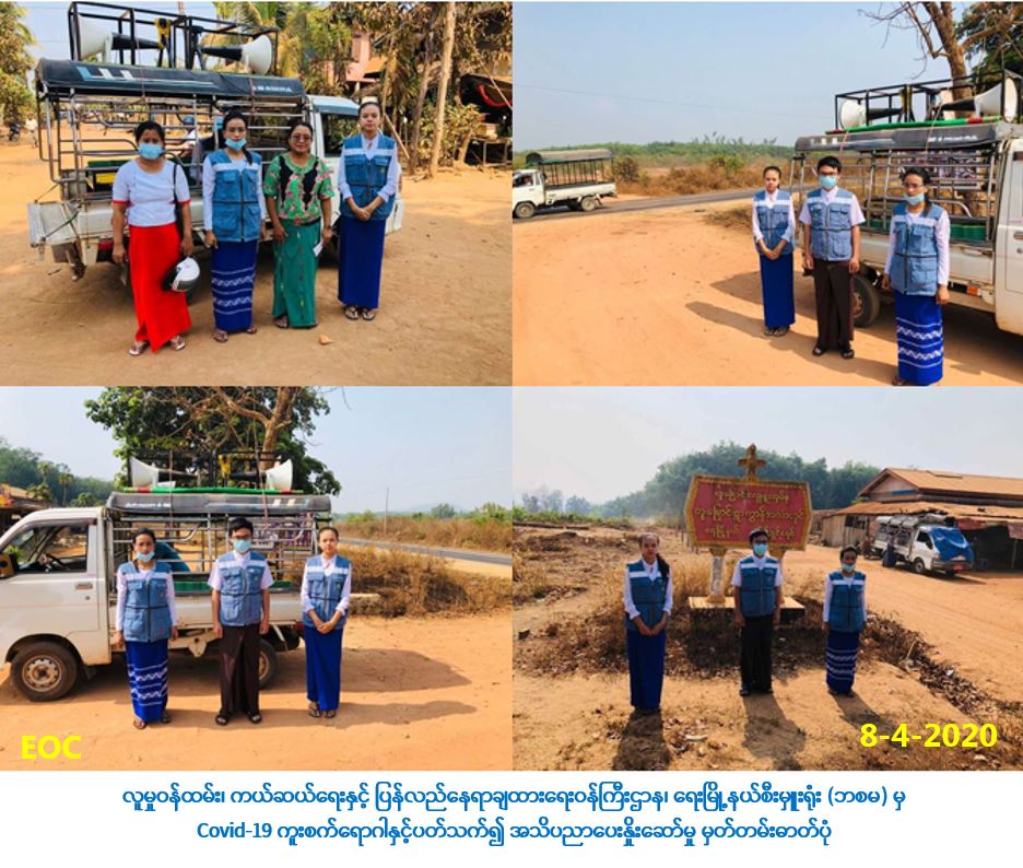 လူမှုဝန်ထမ်း၊ ကယ်ဆယ်ရေးနှင့် ပြန်လည်နေရာချထားရေးဝန်ကြီးဌာန၊ ဘေးအန္တရာယ်ဆိုင်ရာစီမံ ခန့်ခွဲမှုဉီးစီးဌာန၊ ရေးမြို့နယ်ဦးစီးမှူးရုံးမှ တာဝန်ရှိသူများသည် (၈-၄-၂၀၂၀) ရက်နေ့၊ (၀၉:၀၀) နာရီ အချိန်မှ (၁၂:၀၀) နာရီအချိန်ထိမွန်ပြည်နယ်၊ မော်လမြိုင်ခရိုင်၊ေရးမြို့နယ်၊ ကျုံပေါကျေးရွာ၊ ပေါ့ထော်နှင့်တူးမြောင်းကျေးရွာတို့တွင် COVID-19 ကူးစက်ရောဂါနှင့်ပတ်သက်၍ ကြိုတင်ကာကွယ် ထိန်းချုပ်နိုင်ရန် ပြည်သူသို့ အသိပညာပေးခြင်းလုပ်ငန်းများ ဆောင်ရွက်ခဲ့ပါကြောင်း သတင်းရရှိပါသည်။