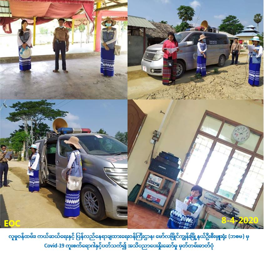 လူမှုဝန်ထမ်း၊ ကယ်ဆယ်ရေးနှင့် ပြန်လည်နေရာချထားရေးဝန်ကြီးဌာန၊ ဘေးအန္တရာယ်ဆိုင်ရာစီမံ ခန့်ခွဲမှုဦးစီးဌာန၊ မော်လမြိုင်ကျွန်းမြို့နယ်ဦးစီးမှူးရုံးမှ တာဝန်ရှိသူများသည် (၈-၄-၂၀၂၀) ရက်နေ့၊ (၀၉း၀၀) နာရီအချိန်မှ (၁၂း၀၀)နာရီအချိန်ထိ အထွေထွေအုပ်ချုပ်ရေးဦးစီးဌာန၊ မြို့နယ်ကြက်ခြေနီ တပ်ဖွဲ့တို့နှင့် အတူပူးပေါင်း၍ မော်လမြိုင်ကျွန်းမြို့နယ်၊ ရေလိမ်ကျေးရွာအုပ်စုအတွင်းရှိ ကျေးရွာများ၌ ဌာနမှပေးပို့ထားသော Covid-19နှင့်ပတ်သက်သည့် ဆောင်ရန်/ရှောင်ရန် အသံဖိုင်ဖြင့်လည်းကောင်း၊ Hand Speaker ၊ Loud Speaker များဖြင့်လည်းကောင်း လှည့်လှည်၍ အသိပညာပေးလုပ်ဆောင်မှုများ ပြုလုပ်ဆောင်ရွက်ခဲ့ပါကြောင်း သတင်းရရှိပါသည်။