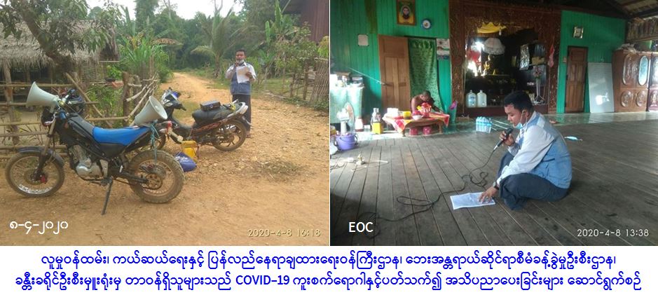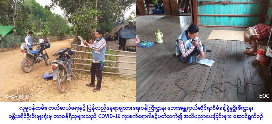 လူမှုဝန်ထမ်း၊ ကယ်ဆယ်ရေးနှင့် ပြန်လည်နေရာချထားရေးဝန်ကြီးဌာန၊ ဘေးအန္တရာယ်ဆိုင်ရာစီမံ ခန့်ခွဲမှုဦးစီးဌာန၊ ခန္တီးခရိုင်ဦးစီးမှူးရုံးမှ တာဝန်ရှိသူများသည် (၈-၄-၂၀၂၀) ရက်နေ့၊ (၁၃:၀၀) နာရီအချိန်မှ (၁၇:၃၀) နာရီအချိန်ထိ ခန္တီးမြို့နယ်အတွင်းရှိ လင်းဖားကျေးရွာနှင့် ချောင်းဝကျေးရွာများတွင် COVID-19 ရောဂါ ကူးစက်ပျံ့နှံ့မှုမဖြစ်ပွားစေရန် သိရှိ လိုက်နာဆောင်ရွက်ရမည့် အချက်များကို အသိပညာပေးခြင်းများ ဆောင်ရွက်ခဲ့ကြောင်း သတင်းရရှိပါသည်။