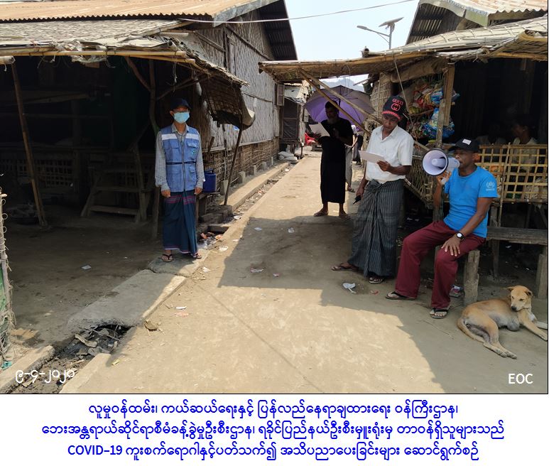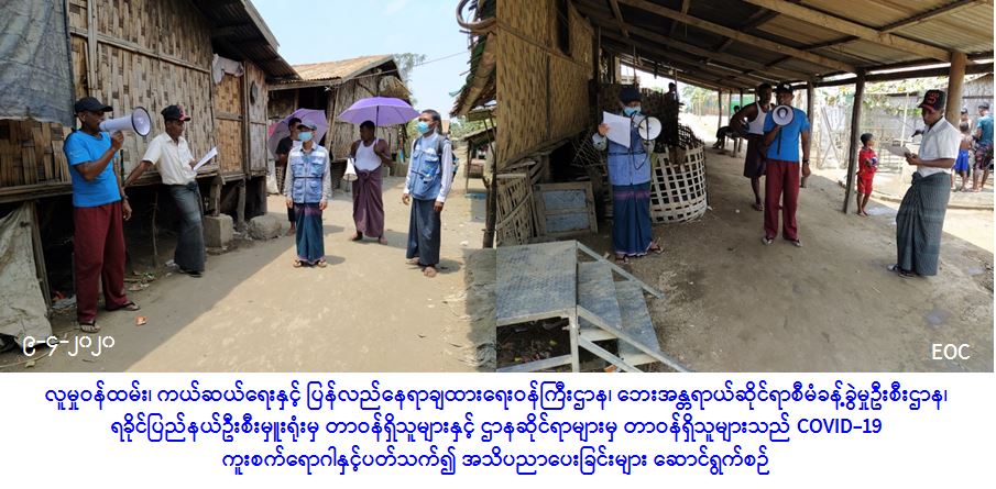 လူမှုဝန်ထမ်း၊ ကယ်ဆယ်ရေးနှင့် ပြန်လည်နေရာချထားရေးဝန်ကြီးဌာန၊ ဘေးအန္တရာယ်ဆိုင်ရာစီမံ ခန့်ခွဲမှုဦးစီးဌာန၊ ရခိုင်ပြည်နယ်ဦးစီးမှူးရုံးမှ တာဝန်ရှိသူများသည် (၉-၄-၂၀၂၀) ရက်နေ့၊ (၁၁:၀၀) နာရီအချိန်တွင် ပေါက်တောမြို့၊ ဆင်တက်မော် IDP စခန်း၌ စခန်းနေပြည်သူများအား COVID-19 ကူးစက်ရောဂါနှင့်ပတ်သက်ပြီး ဆောင်ရန်၊ ရှောင်ရန်များအား စခန်းကော်မတီဝင်များနှင့်ပူးပေါင်း၍ အသိပညာပေးခြင်းများ ဆောင်ရွက်ခဲ့ကြောင်း သတင်းရရှိပါသည်။