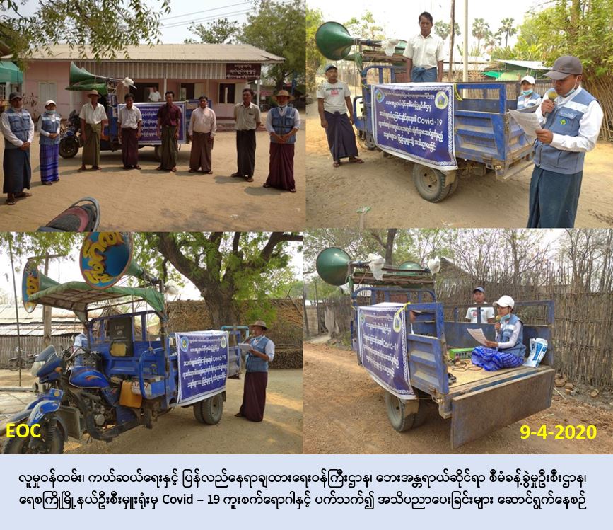လူမှုဝန်ထမ်း၊ ကယ်ဆယ်ရေးနှင့် ပြန်လည်နေရာချထားရေးဝန်ကြီးဌာန၊ ဘေးအန္တရာယ်ဆိုင်ရာ စီမံခန့်ခွဲမှုဦးစီးဌာန၊ ရေစကြိုမြို့နယ်ဦးစီးမှူးရုံးမှ တာဝန်ရှိသူများသည် (၉-၄-၂၀၂၀) ရက်နေ့ တွင် (၀၈:၀၀) နာရီမှ(၁၂:၀၀)နာရီအချိန်ထိ ရေစကြိုမြို့နယ်၊ ပရိမ်သာကျေးရွာအုပ်စု၊ ပရိမ်သာ ကျေးရွာ၊ အောက်အို (အရှေ့) ကျေးရွာ၊ အောက်အို (အနောက်) ကျေးရွာနှင့် ထင်းတန်းကျေးရွာ များသို့ COVID-19 ရောဂါကူးစက်ပျံ့နှံ့မှုများ မဖြစ်ပွားစေရန်အတွက် သိရှိလိုက်နာဆောင်ရွက်ရန် များကို လောစပီကာဖြင့် အသိပေးကြေညာဆောင်ရွက်ခြင်းပြုလုပ်ခဲ့ပါကြောင်း သတင်းရရှိပါ သည်။