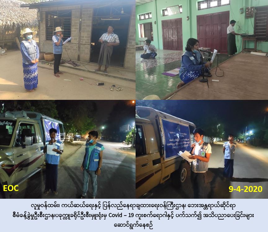 လူမှုဝန်ထမ်း၊ ကယ်ဆယ်ရေးနှင့် ပြန်လည်နေရာချထားရေးဝန်ကြီးဌာန၊ ဘေးအန္တရာယ်ဆိုင်ရာ စီမံခန့်ခွဲမှုဦးစီးဌာန၊ ပခုက္ကူခရိုင်ဦးစီးမှူးရုံးမှ တာဝန်ရှိသူများသည် (၉-၄-၂၀၂၀) ရက်နေ့ ၊ (၀၇:၀၀) နာရီအချိန်မှ (၁၃:၀၀) နာရီအချိန်ထိ ပခုက္ကူမြို့နယ်၊ မကျီးသုံးပင်ကျေးရွာအုပ်စု၊ မကျီးသုံးပင်ကျေးရွာ၊ သံဘိုကျေးရွာနှင့် သစ်ပုလွေကုန်းကျေးရွာများသို့ သွားရောက်အသိပညာ ပေးခြင်း နှင့် နေ့စဉ် (၁၉:၀၀)အချိန်မှ (၂၁:၀၀)အချိန်အထိ ပခုက္ကူမြို့ပေါ်ရပ်ကွက်များသို့ COVID -19 ကူးစက်မြန်ရောဂါ ကြိုတင်ကာကွယ်ရေးပြည်သူများသို့ အသိပညာပေး ပန်ကြားချက် များအား လှည့်လည်အသိပေးခြင်းတို့ကို ဆောင်ရွက်ခဲ့ပါကြောင်း သတင်းရရှိပါသည်။