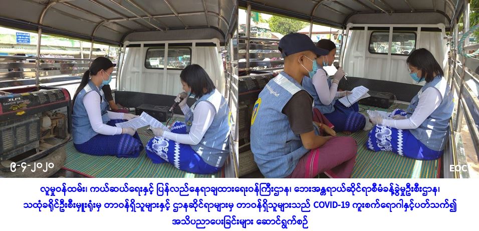 လူမှုဝန်ထမ်း၊ ကယ်ဆယ်ရေးနှင့် ပြန်လည်နေရာချထားရေးဝန်ကြီးဌာန၊ ဘေးအန္တရာယ်ဆိုင်ရာစီမံ ခန့်ခွဲမှုဦးစီးဌာန၊ သထုံခရိုင်ဦးစီးမှူးရုံးမှ တာဝန်ရှိသူများသည် (၉-၄-၂၀၂၀) ရက်နေ့၊ (၁၀:၀၀) နာရီအချိန်မှ (၁၃:၃၀) နာရီအချိန်ထိ သထုံမြို့နယ် သုဝဏ္ဏဝတီမြို့ ကျိုက်ကော်ရပ်ကွက်နှင့် သိမ်ဆိပ်ရပ်ကွက်တို့တွင် COVID-19 ကူးစက်ရောဂါနှင့်ပတ်သက်ပြီး ဆောင်ရန်၊ ရှောင်ရန်များ အသိပညာပေးခြင်းကို ဆောင်ရွက်ခဲ့ကြောင်း သတင်းရရှိပါသည်။