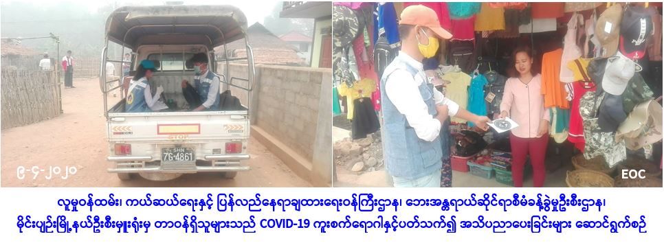 လူမှုဝန်ထမ်း၊ ကယ်ဆယ်ရေးနှင့် ပြန်လည်နေရာချထားရေးဝန်ကြီးဌာန၊ ဘေးအန္တရာယ်ဆိုင်ရာစီမံ ခန့်ခွဲမှုဦးစီးဌာန၊ မိုင်းပျဉ်းမြို့နယ်ဦးစီးမှူးရုံးမှ တာဝန်ရှိသူများသည် (၉-၄-၂၀၂၀) ရက်နေ့တွင် မိုင်းပျဉ်းမြို့၊ အလယ်ပိုင်းရပ်ကွက်နှင့် လွန်ကြိုင်းကျေးရွာတို့တွင် COVID-19 ရောဂါ ကူးစက်ပျံ့နှံ့မှုမဖြစ်ပေါ်စေရန် သိရှိလိုက်နာဆောင်ရွက်ရမည့်အချက်များကို ကျေးရွာအုပ်ချုပ်ရေးမှူး၊ ရပ်/ကျေးစာရေးတို့နှင့် ပူးပေါင်း၍ ဗမာဘာသာနှင့် ရှမ်းဘာသာတို့ဖြင့် အသိပညာပေးခြင်း၊ လက်ကမ်းစာစောင်များ ဖြန့်ဝေခြင်းတို့ကို ဆောင်ရွက်ခဲ့ကြောင်း သတင်းရရှိပါသည်။