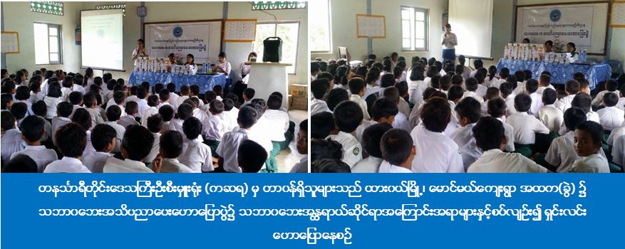 (၂၁-၆-၂၀၁၆) ရက်နေ့တွင် တနင်္သာရီတိုင်းဒေသကြီး၊ ထားဝယ်မြို့၊ မောင်မယ်ကျေးရွာ အထက (ခွဲ) ၌ တနင်္သာရီတိုင်းဒေသကြီးဦးစီးမှူးရုံး (ကဆရ) မှ တာဝန်ရှိသူများသည် သဘာဝဘေးအသိပညာပေးဟောပြောပွဲကျင်းပပြုလုပ်ခဲ့ရာ ဟောပြောပွဲသို့ ကျောင်းသား/သူ (၃၅၀) ဦး တက်ရောက်ခဲ့ကြောင်းနှင့် ကျောင်းသား/သူများအတွက် ဗလာစာအုပ်၊ ခဲတံ၊ ဘောလ်ပင်များနှင့် သဘာဝဘေးအန္တရာယ်ဆိုင်ရာလက်ကမ်းစာစောင်များ ဖြန့်ဝေပေးခဲ့ကြောင်း သိရှိရပါသည်။
