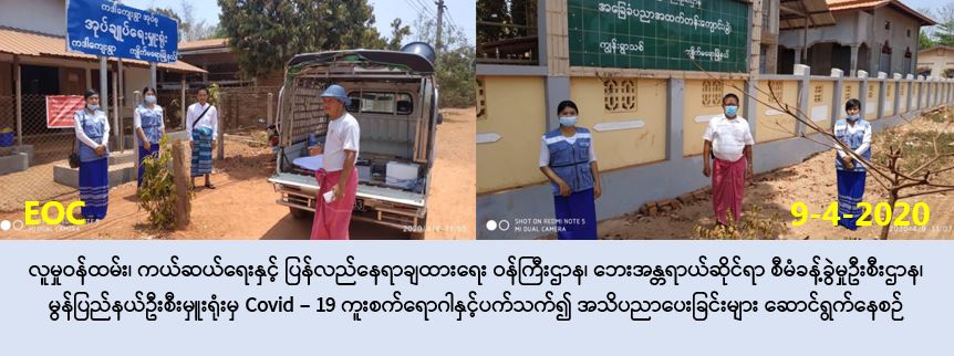 လူမှုဝန်ထမ်း၊ ကယ်ဆယ်ရေးနှင့် ပြန်လည်နေရာချထားရေးဝန်ကြီးဌာန၊ ဘေးအန္တရာယ်ဆိုင်ရာ စီမံခန့်ခွဲမှုဦးစီးဌာန၊ မွန်ပြည်နယ်ဦးစီးမှူးရုံးမှ တာဝန်ရှိသူများသည် (၉-၄-၂၀၂၀) ရက်နေ့တွင် မွန်ပြည်နယ်၊ ကျိုက်မရောမြို့နယ်၊ ကျွန်းရွာကျေးရွာနှင့် ကဒါကျေးရွာတို့တွင် COVID -19 ကူးစက်ရောဂါနှင့်ပတ်သက်၍ ကြိုတင်ကာကွယ် ထိန်းချုပ်နိုင်ရန် ပြည်သူသို့ အသိပညာပေး ပန်ကြားချက်များအား အသံချဲ့စက်များဖြင့် လှည့်လည်အသိပေး ဟောပြောခြင်းများ ဆောင်ရွက်ခဲ့ကြောင်း သတင်းရရှိပါသည်။