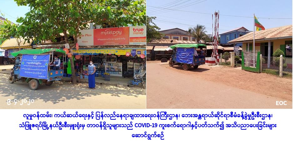 လူမှုဝန်ထမ်း၊ ကယ်ဆယ်ရေးနှင့် ပြန်လည်နေရာချထားရေးဝန်ကြီးဌာန၊ ဘေးအန္တရာယ်ဆိုင်ရာစီမံ ခန့်ခွဲမှုဦးစီးဌာန၊ သံဖြူဇရပ်မြို့နယ်ဦးစီးမှူးရုံးမှ တာဝန်ရှိသူများသည် (၉-၄-၂၀၂၀) ရက်နေ့၊ (၁၀:၀၀) နာရီအချိန်မှ (၁၅:၀၀) နာရီအချိန်ထိ မော်လမြိုင်ခရိုင်၊ သံဖြူဇရပ်မြို့နယ်၊ ကျိုက္ခမီမြို့၊ ဓမ္မစေတီရပ်ကွက်၊ မြို့မဈေးရပ်ကွက်နှင့် အောင်သုခရပ်ကွက်များသို့ သွားရောက်၍ COVID-19 ကူးစက်ရောဂါနှင့်ပတ်သက်၍ ကြိုတင်ကာကွယ် ထိန်းချုပ်နိုင်ရန် ပြည်သူသို့ အသိပညာပေးခြင်းများ ဆောင်ရွက်ခဲ့ကြောင်း သတင်းရရှိပါသည်။