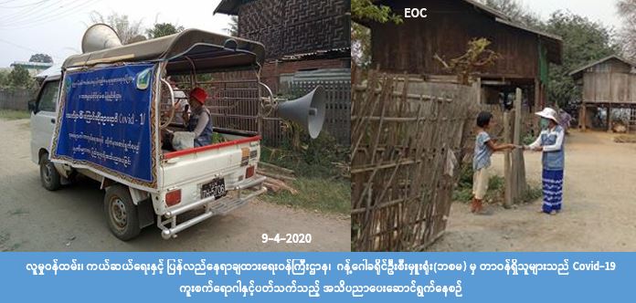 လူမှုဝန်ထမ်း၊ ကယ်ဆယ်ရေးနှင့် ပြန်လည်နေရာချ ထားရေးဝန်ကြီးဌာန၊ ဘေးအန္တရာယ်ဆိုင်ရာစီမံခန့် ခွဲမှုဦးစီးဌာန၊ ဂန့်ဂေါခရိုင်ဦးစီးမှူးရုံးမှ တာဝန်ရှိသူများသည် ပြန်ကြားရေးနင့် ပြည်သူ့ဆက်ဆံရေးဦးစီး ဌာန၊ မာဃသဟာယလူမှုအထောက်အကူပြုအဖွဲ့တို့ဖြင့်ပူးပေါင်းပြီး ဂန့်ဂေါခရိုင်၊ ဂန့်ဂေါမြို့နယ်၊ ကျွဲနန်း ကျေးရွာ၊ တောင်လယ်ကျေးရွာ၊ လက်ပန်ကျေးရွာ၊ သာကောင်းကျေးရွာများသို့ (၉-၄-၂၀၂၀) ရက်နေ့ (၀၈:၃၀) နာရီမှ(၁၆:၃၀)နာရီ အချိန်ထိ COVID-19 ရောဂါနှင့်ပတ်သက်၍ ကာကွယ်၊ တားဆီး၊ ထိန်းချုပ်၊ ကုသရေးဆိုင်ရာ ပြည်သူလူထုအသိပညာပေးပန်ကြားချက်များကို လှည့်လည်ဟောပြော ဆောင်ရွက်ခဲ့ ကြောင်း သိရှိရပါသည်။