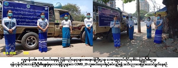 လူမှုဝန်ထမ်း၊ ကယ်ဆယ်ရေးနှင့် ပြန်လည်နေရာချထားရေးဝန်ကြီးဌာန၊ ဘေးအန္တရာယ်ဆိုင်ရာစီမံခန့်ခွဲမှုဉီးစီးဌာန၊ ရန်ကုန်တိုင်းဒေသကြီးဦးစီးမှူးရုံးမှတာဝန်ရှိသူများသည် (၉-၄-၂၀၂၀) ရက်နေ့တွင် တိုင်းဒေသကြီးလူမှုဝန်ထမ်း ဦးစီးဌာနမှူးရုံးတို့နှင့်ပူးပေါင်း၍ ရန်ကုန်အရှေ့ပိုင်းခရိုင်၊ မင်္ဂလာတောင်ညွန့်မြို့နယ်၊ ရေတွင်းကုန်းရပ်ကွက်၊ သာယာကုန်းရပ်ကွက်၊ ကျီတော်ရပ်ကွက်၊ တောင်လုံးပြန်ရပ်ကွက်၊ ကူးတို့ဆိပ်ရပ်ကွက်၊ ပုသိမ်ညွန့်ရပ်ကွက်၊ စက်ဆန်းရပ်ကွက်၊ ကန်တော်လေးအရှ့ရပ်ကွက်တို့၌လည်းကောင်း၊ ရန်ကုန်တောင်ပိုင်းခရိုင်၊ ကျောက်တန်းမြို့နယ်၊ တံတားမြို့၊ တံတားမြောက်အမှတ်(၁/၂)ရပ်ကွက်၊ တံတားတောင်အမှတ်(၁/၂)ရပ်ကွက်၊ ဘုရင့်နောင်လမ်းမကြီး၊ အနော်ရထာလမ်းမကြီး၊ ပန်းချောင်းကျေးရွာ၊ ဆင်မကော်ကျေးရွာ၊ ကဒ္ဒပ္ပနကျေးရွာတို့၌လည်းကောင်း COVID-19 ကူးစက်ရောဂါနှင့်စပ်လျဉ်း၍ ဆောင်ရန်/ရှောင်ရန်အချက်များကိုအသိပညာပေးခြင်း၊ ကျန်းမာရေးနှင့် အားကစားဝန်ကြီးဌာနမှ ထုတ်ပြန်ထားသော အသိပေးကြေညာချက်များ၊ လူမှုဝန်ထမ်း၊ ကယ်ဆယ်ရေးနှင့် ပြန်လည်နေရာချထားရေးဝန်ကြီးဋ္ဌာနမှ ထုတ်ပြန်ထားသော ဥပဒေများကိုလိုက်နာရန် အသိပေးကြေညာချက်များအား သက်ဆိုင်ရာကျန်းမာရေးဦးစီးဌာန၊ အထွေထွေအုပ်ချုပ်ရေးဦးစီးဌာန မှတာဝန်ရှိသူများနှင့် အတူ လှည့်လည်အသိပညာပေးနှိုးဆော်ခြင်းများဆောင်ရွက်ခဲ့ပါကြောင်း သတင်းရရှိပါသည်။