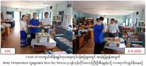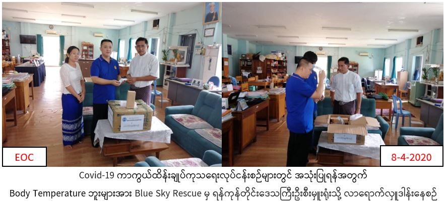 Blue Sky Rescue မှ တာဝန်ရှိသူများသည် Covid-19 ကာကွယ်ထိန်းချုပ်ကုသရေး လုပ်ငန်းစဉ်များတွင် အသုံးပြုရန်အတွက် Body Temperature (၃၀) ဘူးအား (၈-၄-၂၀၂၀)ရက်နေ့တွင် လူမှုဝန်ထမ်း၊ ကယ်ဆယ်ရေးနှင့်ပြန်လည်နေရာချထားရေးဝန်ကြီးဌာန၊ ဘေးအန္တရာယ်ဆိုင်ရာစီမံခန့်ခွဲမှုဦးစီးဌာန ၊ ရန်ကုန်တိုင်းဒေသကြီးဦးစီးမှူးရုံးသို့ လာရောက်လှူဒါန်းခဲ့ကြောင်း သတင်းရရှိပါသည်။