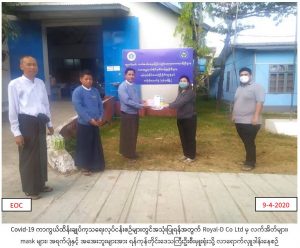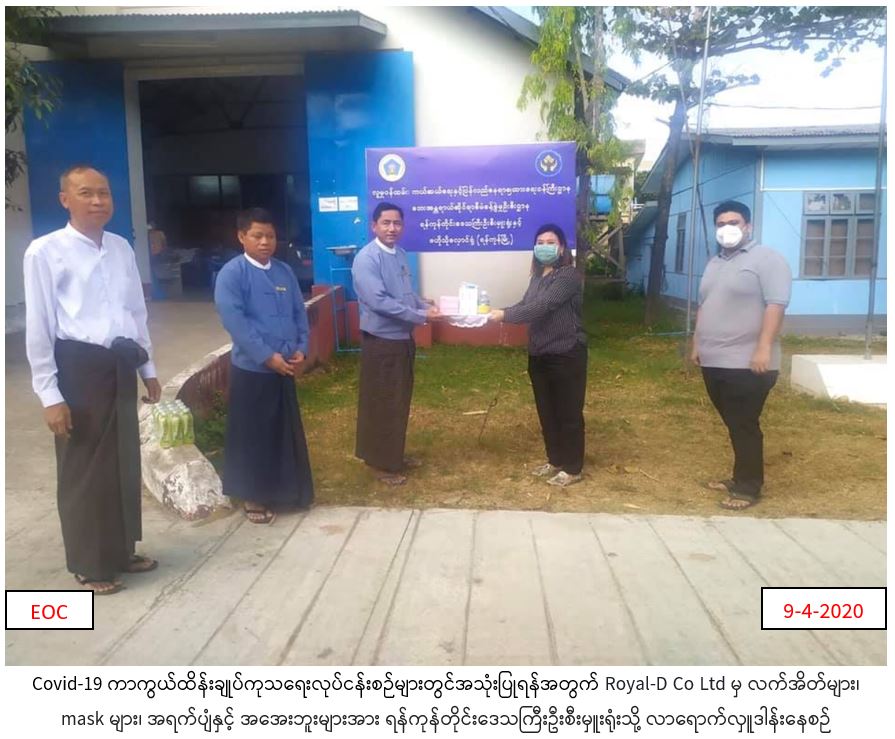Royal-D Co Ltd မှတာဝန်ရှိသူများသည် Covid-19 ကာကွယ်ထိန်းချုပ်ကုသရေးလုပ်ငန်းစဉ်များတွင်အသုံးပြုရန်အတွက် Glove (၁၀၀) ပါ(၁၂၇)ဘူး (၁၂၇၀၀)ခု ၊ Mask (၅၀) ပါ (၉၂)ဘူး (၄၆၀၀) ခု ၊ Methylated Spirit (500ml) ပါ (၂၆၆) ပုလင်း ၊ Royal-D အအေး(၁၂) ဘူးပါ (၃၀) ကဒ် (၃၆၀) ဘူးအား (၉-၄-၂၀၂၀)ရက်နေ့တွင် လူမှုဝန်ထမ်း၊ ကယ်ဆယ်ရေးနှင့်ပြန်လည်နေရာချထားရေးဝန်ကြီးဌာန၊ ဘေးအန္တရာယ်ဆိုင်ရာစီမံခန့်ခွဲမှုဦးစီးဌာန၊ ရန်ကုန်တိုင်းဒေသကြီးဦးစီးမှူးရုံးသို့ လာရောက်လှူဒါန်းခဲ့ကြောင်း သတင်းရရှိပါသည်။