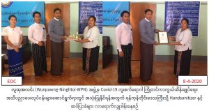 Covid-19 ကူးစက်ရောဂါ ကြိုတင်ကာကွယ်ထိန်းချုပ်ရေးအတွက် ပြည်သူများအကြား အသိပညာပေးလုပ်ငန်းများဆောင်ရွက်စဥ်အသုံးပြုနိုင်ရန် လူထုအလင်း (Wunpawng-Ninghtoi-WPN) အဖွဲ့မှ (၈-၄-၂၀၂၀) ရက်နေ့ ညနေပိုင်းတွင် လူမှုဝန်ထမ်း၊ ကယ်ဆယ်ရေးနှင့်ပြန်လည်နေရာချထားရေးဝန်ကြီးဌာန၊ ဘေးအန္တရာယ်ဆိုင်ရာစီမံခန့်ခွဲမှုဦးစီးဌာန၊ ရန်ကုန်တိုင်းဒေသကြီးဦးစီးမှူးရုံးသို့ Hand Sanitizer ဗူးကြီး(၃၀)ဗူး၊ ဗူးသေး(၂၀၀)ဗူးနှင့် သဘာဝဆပ်ပြာခဲ (၅၀၀)ခဲတို့အား လာရောက်လှူဒါန်းခဲ့ကြောင်း သတင်းရရှိပါသည်။