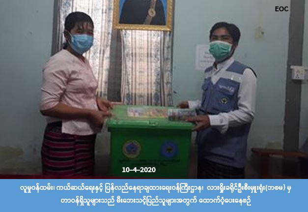(၉-၄-၂၀၂၀)ရက်နေ့ (၁၄:၃၀)အချိန်တွင် ရှမ်းပြည်နယ်၊ လားရှိုးမြို့နယ်၊ မန်ကတ်ကျေးရွာအုပ်စု၊ ဝိန်းစုံကျေးရွာနေ ဒေါ်နိုင်ထွမ်း၊ တောင်ယာလုပ်ကိုင်သူ၏ (၂၀x၁၀)ပေ၊ သွပ်မိုး၊ ထရံကာ နေအိမ် (၁) လုံး မီးကြွင်းမီးကျန်မှတစ်ဆင့် မီးလောင်မှုဖြစ်ပွားခဲ့ရာ နေအိမ် (၁)လုံးပျက်စီးခဲ့ပြီး တန်ဖိုးငွေ (၁,၂၀၀,၀၀၀) ကျပ်ဆုံးရှုံးခဲ့ရာ အဆိုပါမီးဘေးသင့်အိမ်ထောင်စု (၁) စုအတွက် ကယ်ဆယ်ရေးပစ္စည်း (၂၂) မျိုး (၁) စု စာနှင့် အိမ်ဆောက်ပစ္စည်းတန်ဖိုး (၁၀၀,၀၀၀) ကျပ်နှင့် လူဦးရေ(၅)ဦးအတွက် ဆန်ရိက္ခာဖိုး (၇) ရက် စာ(၁၀,၅၀၀) ကျပ်တို့ကို လူမှုဝန်ထမ်း၊ ကယ်ဆယ်ရေးနှင့် ပြန်လည်နေရာချထားရေးဝန်ကြီးဌာန၊ ဘေးအန္တရာယ်ဆိုင်ရာစီမံခန့်ခွဲမှုဦးစီးဌာန၊ လားရှိုးခရိုင်ဦးစီးမှူးရုံးမှ တာဝန်ရှိသူများသည် မန်ကတ် ကျေးရွာအုပ်စုစာရေးအား (၁၀-၄-၂၀၂၀) ရက်နေ့တွင် လွှဲပြောင်းထောက်ပံ့ပေးအပ်ခဲ့ကြောင်း သိရှိရပါ သည်။