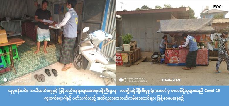 လူမှုဝန်ထမ်း၊ ကယ်ဆယ်ရေးနှင့် ပြန်လည်နေရာချထားရေးဝန်ကြီးဌာန၊ ဘေးအန္တရာယ်ဆိုင်ရာ စီမံခန့်ခွဲမှုဦးစီးဌာန၊ လားရှိုးခရိုင်ဦးစီးမှူးရုံးမှ တာဝန်ရှိသူများသည် (၁၀-၄-၂၀၂၀) ရက်နေ့တွင် လားရှိုးမြို့၊ ရပ်ကွက် (၅)၊ ရပ်ကွက် (၆) တို့၌ Covid-19 ရောဂါကူးစက်ပျံ့နှံ့မှုမဖြစ်ပွားစေရန် သိရှိလိုက်နာ ဆောင်ရွက်ရမည့် အချက်များကို အသိပညာပေးဟောပြောခြင်း၊ လက်ကမ်းစာစောင်များ ဖြန့်ဝေခြင်းများကို ဆောင်ရွက်ခဲ့ ကြောင်း သိရှိရပါသည်။