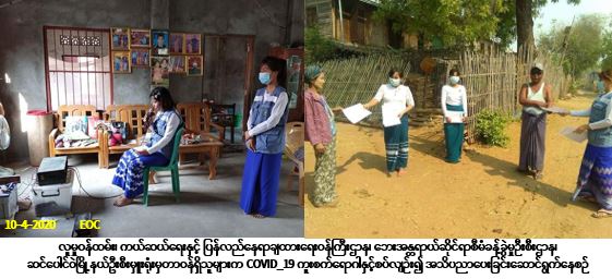 လူမှုဝန်ထမ်း၊ ကယ်ဆယ်ရေးနှင့် ပြန်လည်နေရာချထားရေးဝန်ကြီးဌာန၊ ဘေးအန္တရာယ်ဆိုင်ရာစီမံခန့်ခွဲမှုဉီးစီးဌာန၊ ဆင်ပေါင်ဝဲမြို့နယ်ဦးစီးမှူးရုံးမှတာဝန်ရှိသူများသည် (၁၀-၄-၂၀၂၀) ရက်နေ့၊ (၀၈:၀၀) နာရီအချိန်တွင် ဆင်ပေါင်ဝဲမြို့နယ်၊ အင်းမကျေးရွာအုပ်စု၊ ကရကပ်ကျေးရွာ၊ အလယ်ရွာကျေးရွာနှင့် သာဝတ္တိကျေးရွာများ၌ ပြန်ကြားရေးနှင့်ပြည်သူ့ဆက်ဆံရေးဦးစီးဌာနတို့နှင့်ပူးပေါင်း၍ COVID-19 ကူးစက်ရောဂါနှင့်စပ်လျဉ်း၍ ဆောင်ရန်/ရှောင်ရန်အချက်များကို အသိပညာပေးနှိုးဆော်ခဲ့ပြီး လက်ကမ်းစာစောင်များဖြန့်ဝေခဲ့ပါကြောင်း သတင်းရရှိပါသည်။