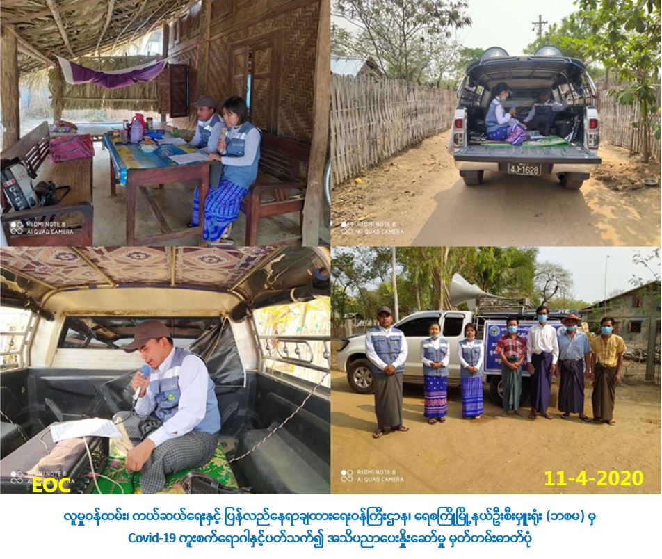 လူမှုဝန်ထမ်း၊ ကယ်ဆယ်ရေးနှင့် ပြန်လည်နေရာချထားရေးဝန်ကြီးဌာန၊ ဘေးအန္တရာယ်ဆိုင်ရာစီမံ ခန့်ခွဲမှုဦးစီးဌာန၊ ရေစကြိုမြို့နယ်ဦးစီးမှူးရုံးမှ တာဝန်ရှိသူများသည် (၁၁-၄-၂၀၂၀) ရက်နေ့တွင် (၀၈း၀၀)နာရီအချိန်မှ စတင်၍ (၁၁း၀၀) အချိန်ထိ ရေစကြိုမြို့နယ်၊ ဇီးတောကျေးရွာအုပ်စု၊ ဇီးတောကျေးရွာနှင့် ဆည်ရွာကျေးရွာများသို့ COVID-19ရောဂါကူးစက်ပျံ့နှံ့မှုများ မဖြစ်ပွားစေရန်အတွက် သိရှိလိုက်နာဆောင်ရွက်ရန်များကို လောစပီကာဖြင့် အသိပေးနှိုးဆော်ခြင်းများ ပြုလုပ်ခဲ့ပါကြောင်း သတင်းရရှိပါသည်။