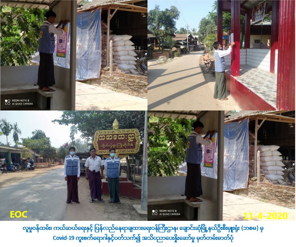 လူမှုဝန်ထမ်း၊ ကယ်ဆယ်ရေးနှင့် ပြန်လည်နေရာချထားရေးဝန်ကြီးဌာန၊ ဘေးအန္တရာယ်ဆိုင်ရာစီမံ ခန့်ခွဲမှုဦးစီးဌာန၊ ချောင်းဆုံမြို့နယ်ဦးစီးမှူးရုံးမှ တာဝန်ရှိသူများသည် (၁၁-၄-၂၀၂၀) ရက်နေ့တွင် (၀၈:၃၀) နာရီအချိန်မှ (၁၀:၃၀) နာရီအချိန်ထိ မွန်ပြည်နယ်၊ မော်လမြိုင်ခရိုင်၊ ချောင်းဆုံမြို့နယ်၊ ကွမ်လှာကျေးရွာနှင့် ကမာကေးကျေးရွာ အတွင်းရှိ လမ်းဆုံလမ်းခွများနှင့် လူစည်ကားရာနေရာများတွင် COVID-19 ကူးစက်ရောဂါနှင့်ပတ်သက်၍ ကြိုတင်ကာကွယ် ထိန်းချုပ် နိုင်ရန် ပြည်သူသို့ အသိပညာပေး ပန်ကြားချက်များအား အသံချဲ့စက်များဖြင့် လှည့်လည်အသိပေးဖွင့်လှစ်ခြင်းများ ဆောင်ရွက်ခဲ့ပါကြောင်း သတင်းရရှိပါသည်။