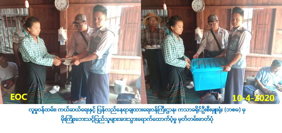 လူမှုဝန်ထမ်း၊ ကယ်ဆယ်ရေးနှင့် ပြန်လည်နေရာချထားရေးဝန်ကြီးဌာန၊ ဘေးအန္တရာယ်ဆိုင်ရာစီမံ ခန့်ခွဲမှုဦးစီးဌာန၊ ကသာခရိုင်ဦးစီးမှူးရုံးမှ တာဝန်ရှိသူများသည် (၁၀-၄-၂၀၂၀) ရက်နေ့တွင် ကသာမြို့နယ်၊ မိုးတားလေးအုပ်စု၊ ဂျပန်ကျွန်းတွင် မိုးကြိုးဘေးကြောင့် နေအိမ်(၁)အိမ် မီးလောင်ခြင်း၊ လူ(၁)ဦးသေဆုံးခြင်း၊ ဒဏ်ရာရ ဆေးရုံတက်ရောက်ကုသသည့် လူနာ(၁) ဦး၊ ဘေးသင့်လူဦးရေ (၁) ဦးစသည်တို့အတွက် မီးလောင် အိမ်ထောင်စု(၁)စုအတွက် အိမ်ဆောက်ပစ္စည်းဖိုးထောက်ပံ့ငွေ (၁၀၀,၀၀၀/-) ကျပ်နှင့် ဆန်ရိက္ခာဖိုး ထောက်ပံ့ငွေ (၂,၁၀၀/-)ကျပ်၊ မိုးကြိုးထိမှန်သေဆုံးသူ (၁) ဦးအတွက် ထောက်ပံ့ငွေ (၃၀၀,၀၀၀/-) ကျပ်၊ ဒဏ်ရာရဆေးရုံတက်ရသူ(၁)ဦးအတွက် ထောက်ပံ့ငွေ (၅၀,၀၀၀/-)ကျပ်၊ စုစုပေါင်း(၄၅၂,၁၀၀/-)ကျပ် နှင့်Family kits (၁)ပုံးတို့အား ဘေးသင့်ပြည်သူထံသို့ (၁၀-၄-၂၀၂၀)ရက်နေ့ ၊(၁၅း၀၀) နာရီအချိန်တွင် သွားရောက်ထောက်ပံ့ခဲ့ပါကြောင်း သတင်းရရှိပါသည်။