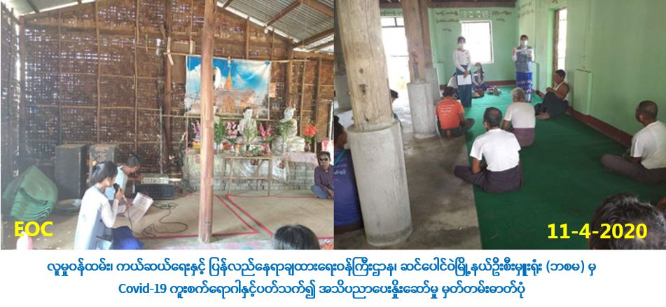 လူမှုဝန်ထမ်း၊ ကယ်ဆယ်ရေးနှင့် ပြန်လည်နေရာချထားရေးဝန်ကြီးဌာန၊ ဘေးအန္တရာယ်ဆိုင်ရာစီမံ ခန့်ခွဲမှုဉီးစီးဌာန၊ ဆင်ပေါင်ဝဲမြို့နယ်ဦးစီးမှူးရုံးမှ တာဝန်ရှိသူများသည် (၁၁-၄-၂၀၂၀) ရက်နေ့၊ နံနက် (၀၈:၀၀) နာရီအချိန်တွင် ပြန်ကြားရေးနှင့်ပြည်သူ့ဆက်ဆံရေးဦးစီးဌာနတို့နှင့် ပူးပေါင်း၍ ဆင်ပေါင်ဝဲမြို့နယ်၊ ရွှေမောင်းစွန်းကျေးရွာအုပ်စု၊ ရွှေမောင်းစွန်းကျေးရွာ၊ ဆိုင်းစုကျေးရွာ ၊ ရှားတိုင်းကြီး ကျေးရွာနှင့် ဆူးလေကုန်းကျေးရွာများသို့ သွားရောက်ပြီး COVID – 19 ရောဂါကူးစက်ပျံ့နှံ့မှုများနှင့် ပတ်သက်၍ အသိပညာပေးဟောပြောမှုများ ဆောင်ရွက်ခဲ့ပြီး လက်ကမ်းစာစောင်များ ဝေငှပေးခဲ့ပါ ကြောင်း သတင်းရရှိပါသည်။