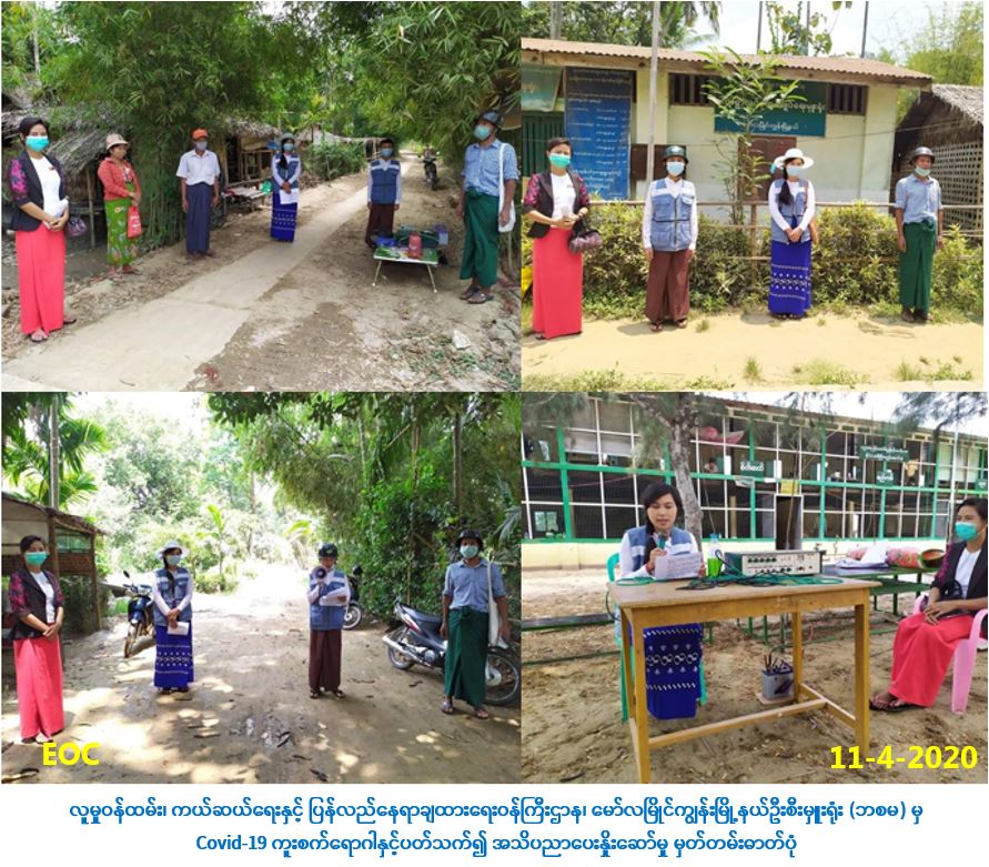လူမှုဝန်ထမ်း၊ ကယ်ဆယ်ရေးနှင့် ပြန်လည်နေရာချထားရေးဝန်ကြီးဌာန၊ ဘေးအန္တရာယ်ဆိုင်ရာစီမံ ခန့်ခွဲမှုဦးစီးဌာန၊ မော်လမြိုင်ကျွန်းမြို့နယ်ဦးစီးမှူးရုံးမှ တာဝန်ရှိသူများသည် (၁၁-၄-၂၀၂၀) ရက်နေ့၊ (၀၉း၀၀)နာရီအချိန်မှ (၁၂း၀၀)နာရီအချိန်ထိ အထွေထွေအုပ်ချုပ်ရေးဦးစီးဌာန၊ လက်ကျန်းမာရေးတို့နှင့် အတူပူးပေါင်း၍ မော်လမြိုင်ကျွန်းမြို့နယ်၊ မရဲ့အုန်းပင်စုကျေးရွာအုပ်စုအတွင်းရှိ ကျေးရွာများ၌ ဌာနမှပေးပို့ထားသော Covid-19 နှင့်ပတ်သက်သည့် ဆောင်ရန်/ရှောင်ရန် အသံဖိုင်ဖြင့်လည်းကောင်း၊ Hand Speaker ၊ Loud Speaker များဖြင့်လည်းကောင်း လှည့်လှည်၍ အသိပညာပေးလုပ်ဆောင်မှုများ ပြုလုပ်ဆောင်ရွက်ခဲ့ပါကြောင်း သတင်းရရှိပါသည်။